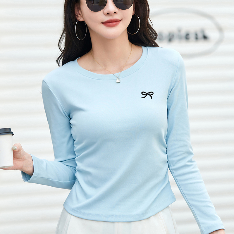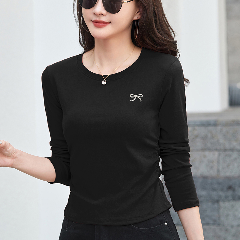 春秋冬薄款褶皱收腰t恤女长袖显瘦短款小个子圆领内搭打底衫上衣