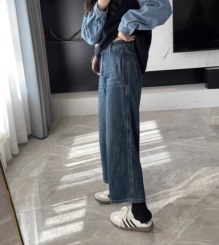 富尔大码定制女装微胖mm复古水洗阔腿牛仔春夏高腰宽松显瘦九分裤