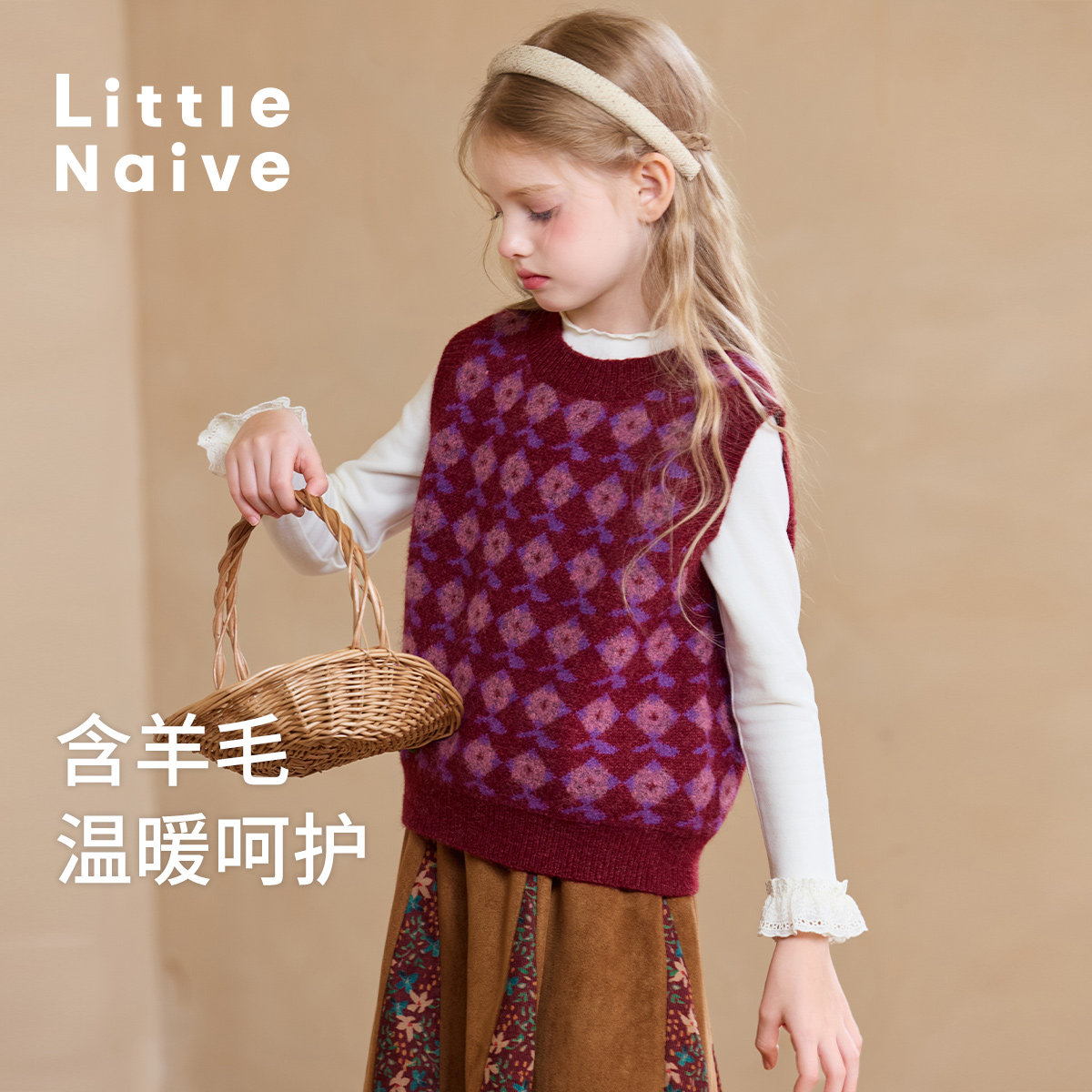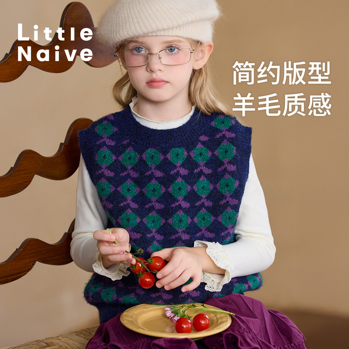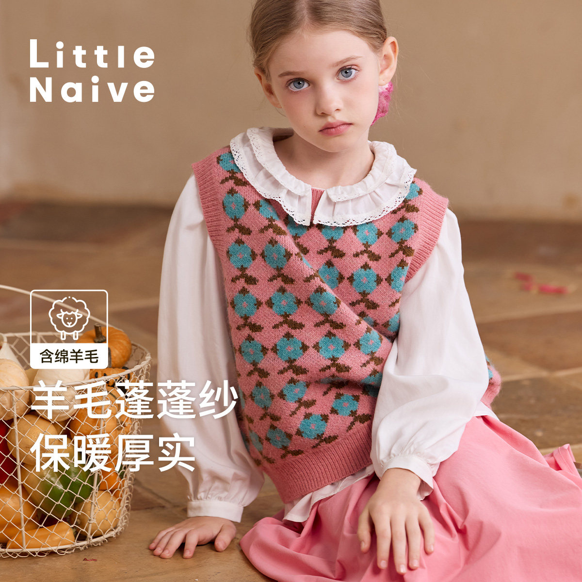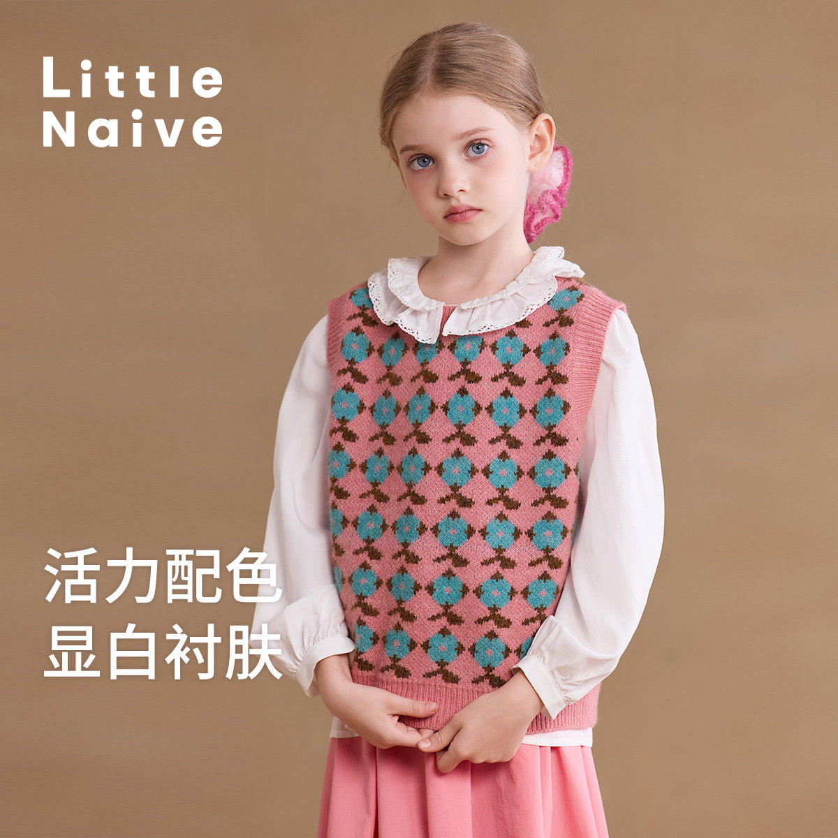 Little Naive儿童针织衫春秋款复古碎花提花针织背心女童羊毛马甲