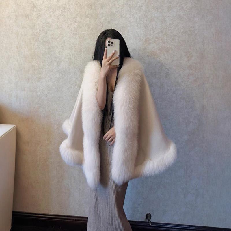 2025冬新款仿狐狸毛呢斗篷式披肩外套女高端时尚外搭皮草洋气大衣