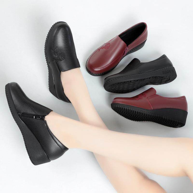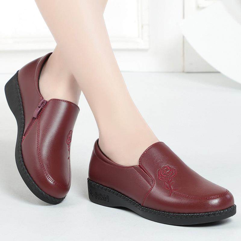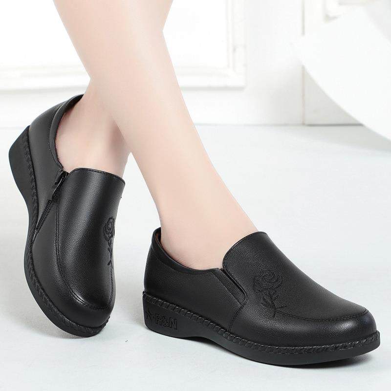 春秋妈妈鞋单鞋软底软皮防滑中老年女鞋平底坡跟皮鞋老人鞋女