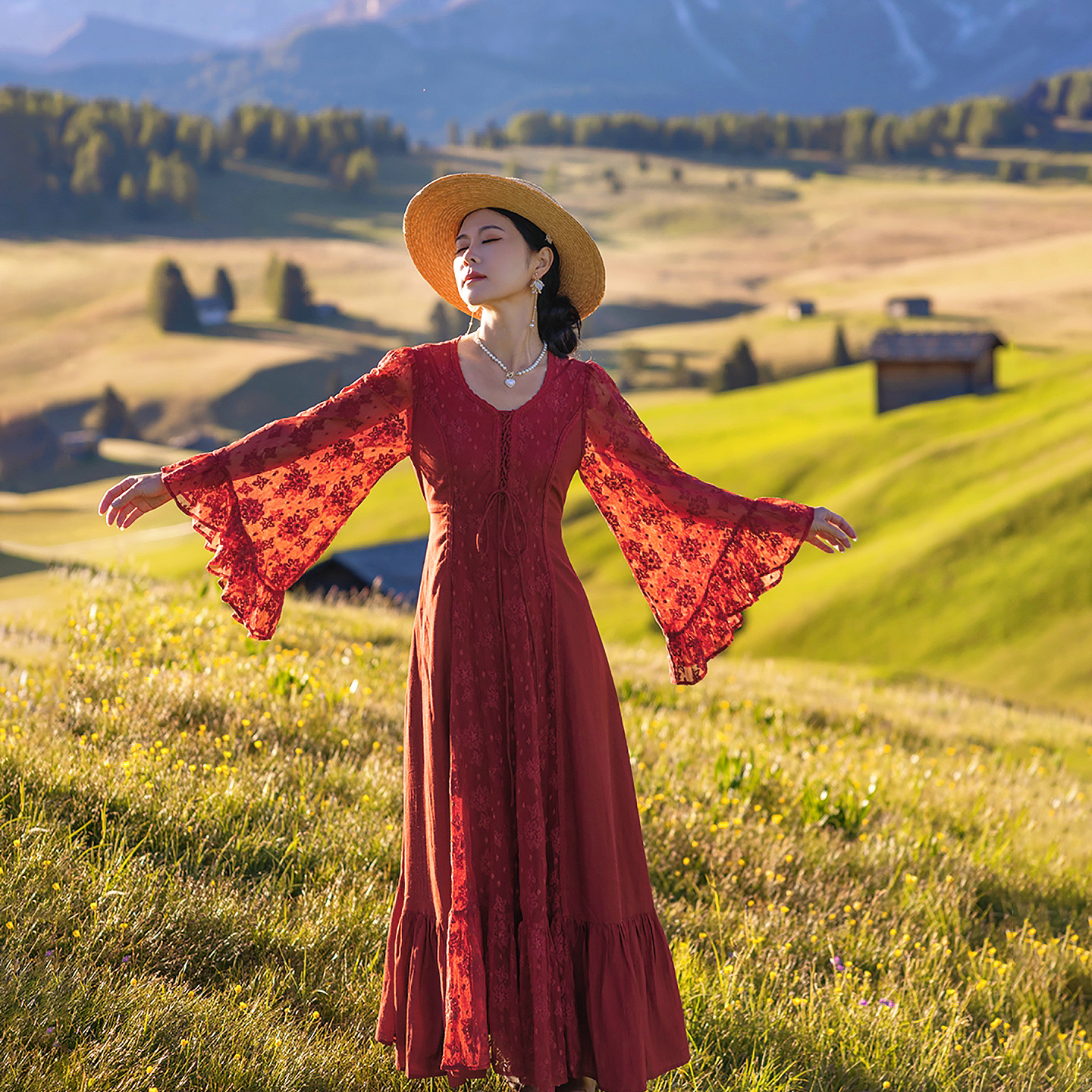 理想三旬女装旅拍复古波西风红色蕾丝拼接大裙摆连衣裙长裙