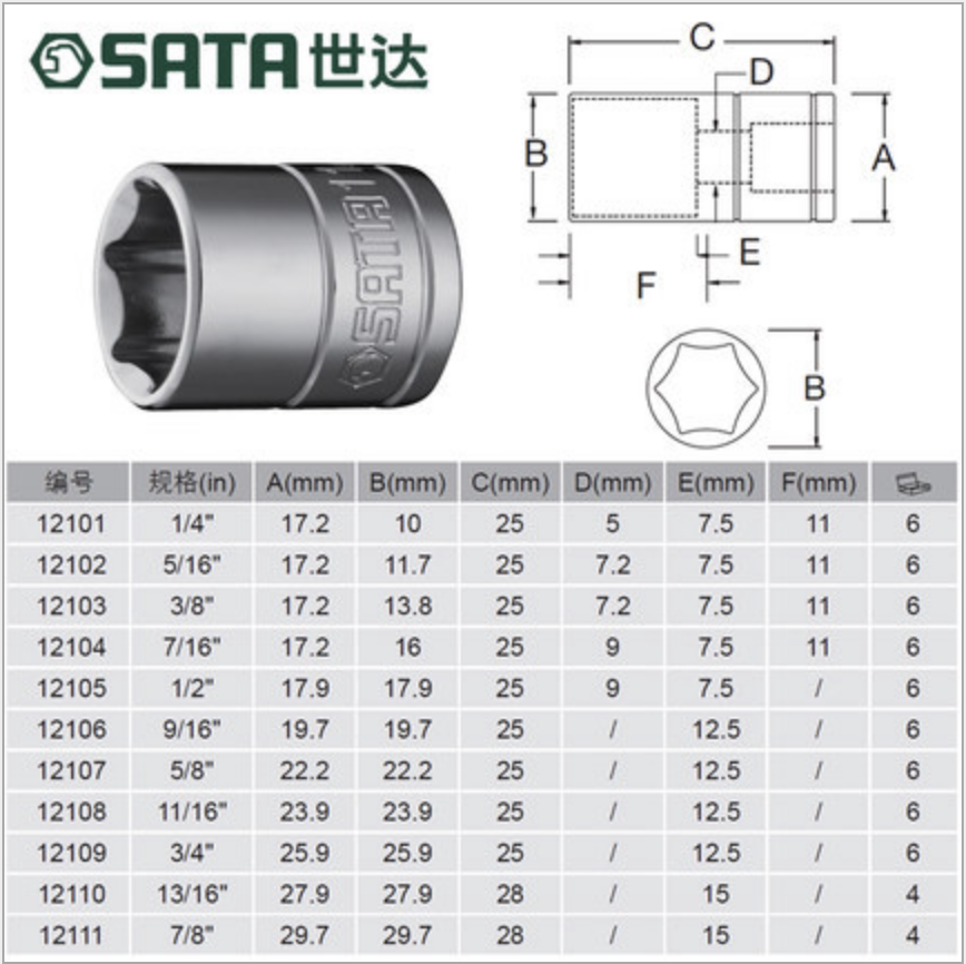 SATA世达套筒10mm系列英制6角套筒12101 12102 12103 12104 12105