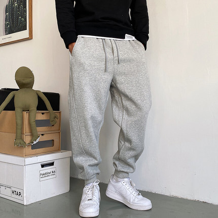 秋冬季美式休闲高端加绒灰色卫裤男宽松抽绳百搭潮流运动束脚裤子