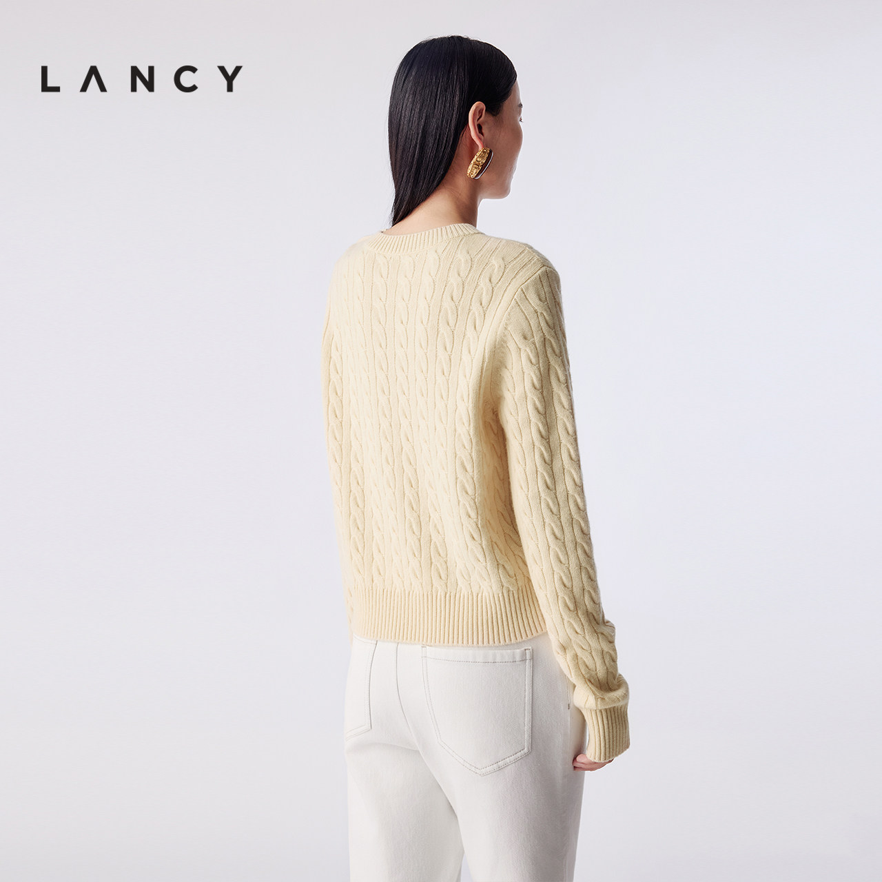【纯羊绒】LANCY/朗姿2025冬新款时尚设计感绞花圆领短款针织衫女