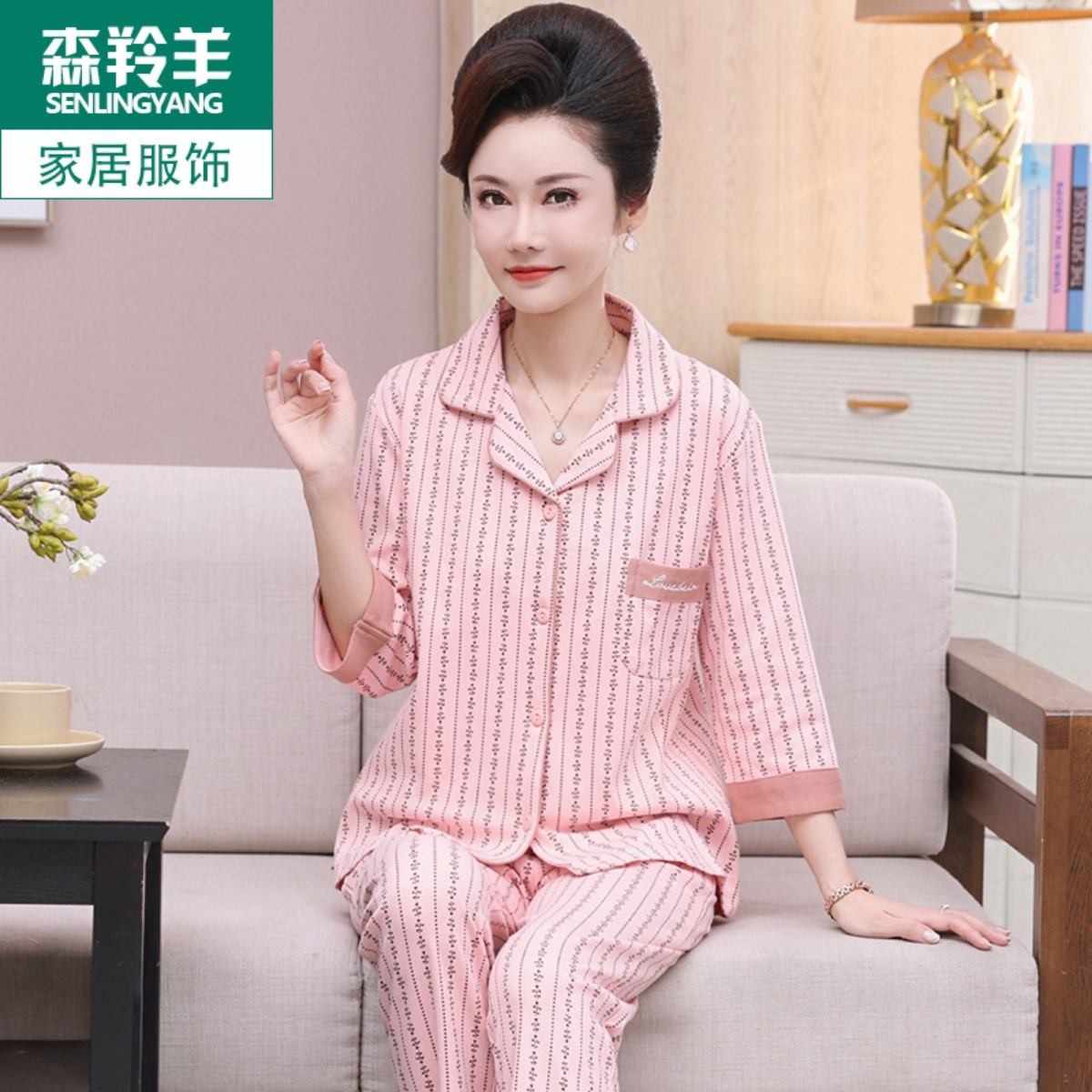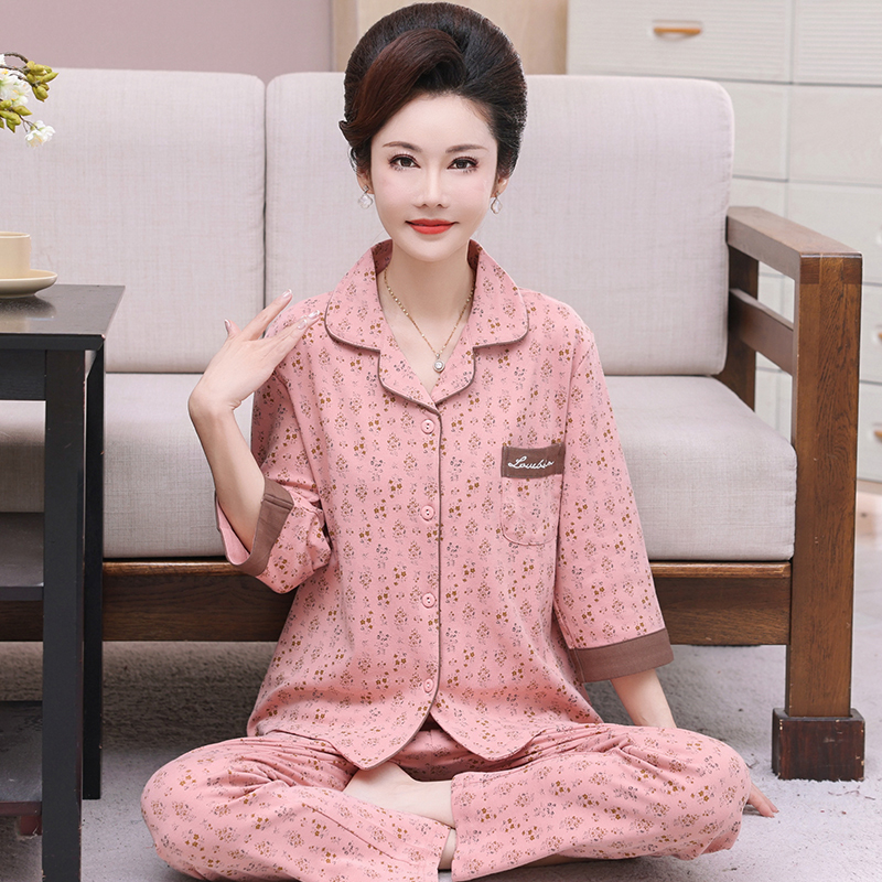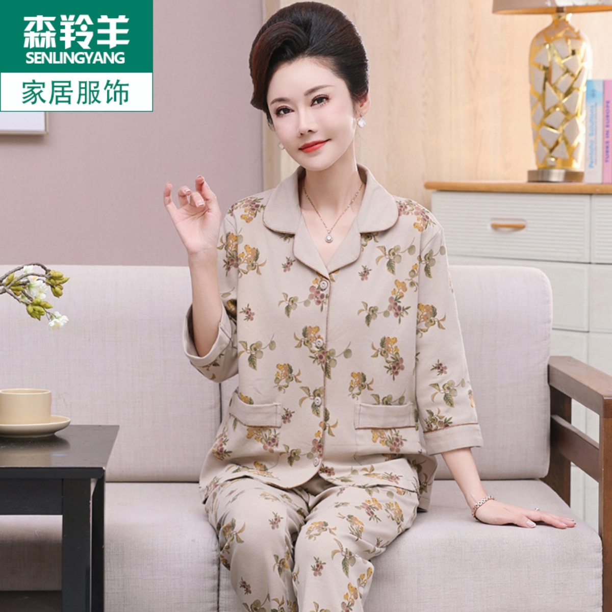 春秋天中老年妈妈睡衣女纯棉七分袖长裤薄款全棉可外穿家居服套装