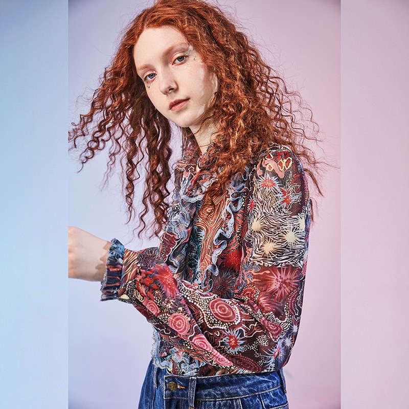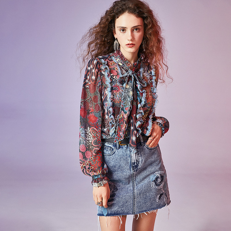 莲灿裂帛春夏新原创设计复古欧式系带荷叶雪纺印花梭织长袖衬衫