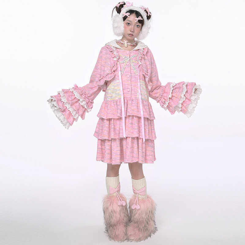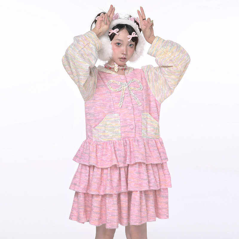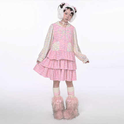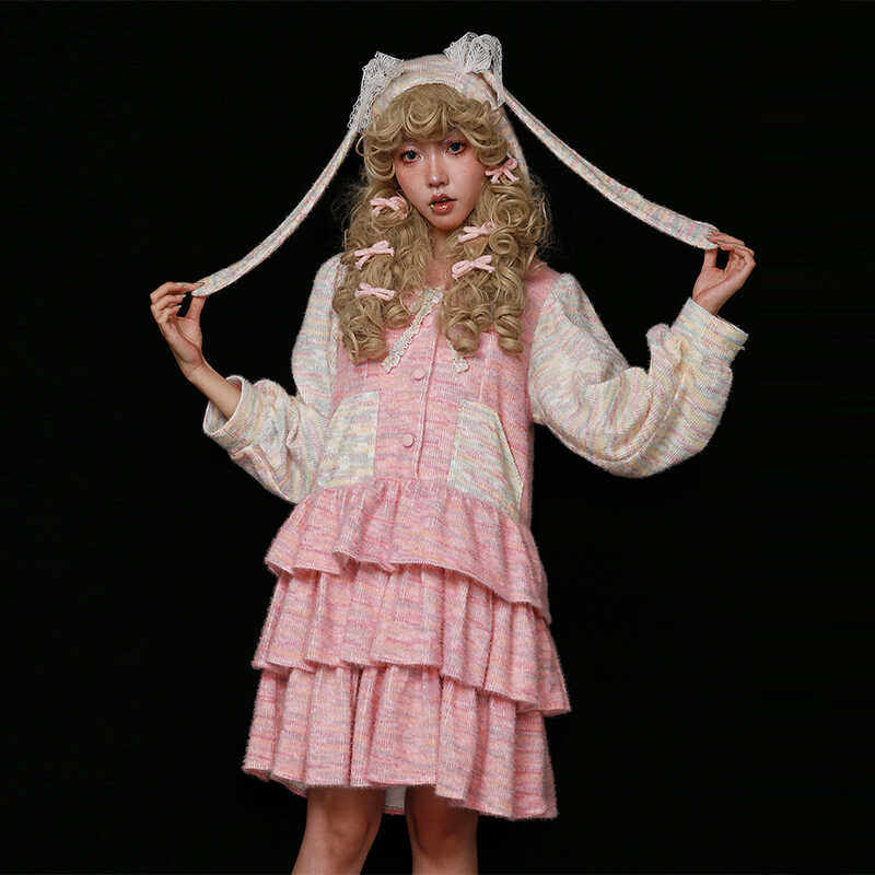 原创设计粉色针织兔耳蛋糕连衣裙
