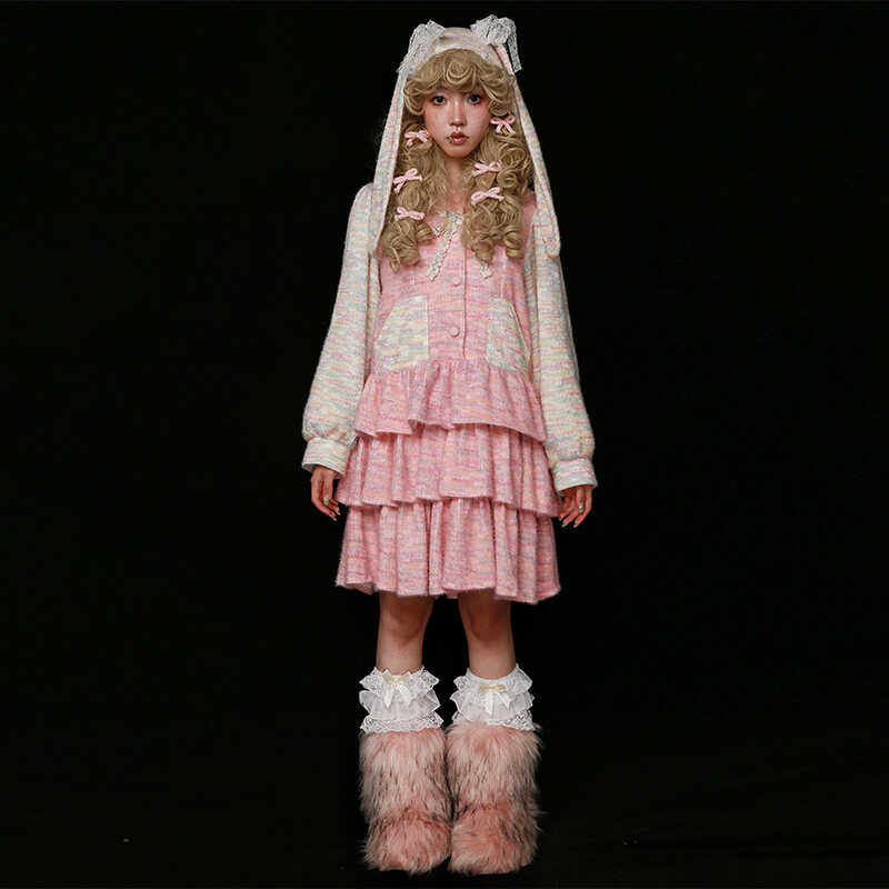 MEME原创设计 日系少女粉色兔耳蛋糕裙 甜美可爱小众连衣裙秋冬