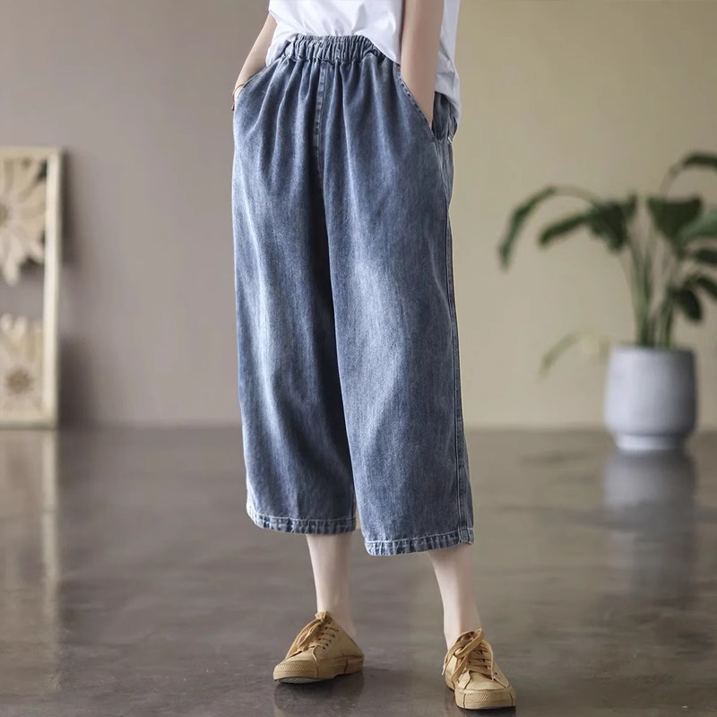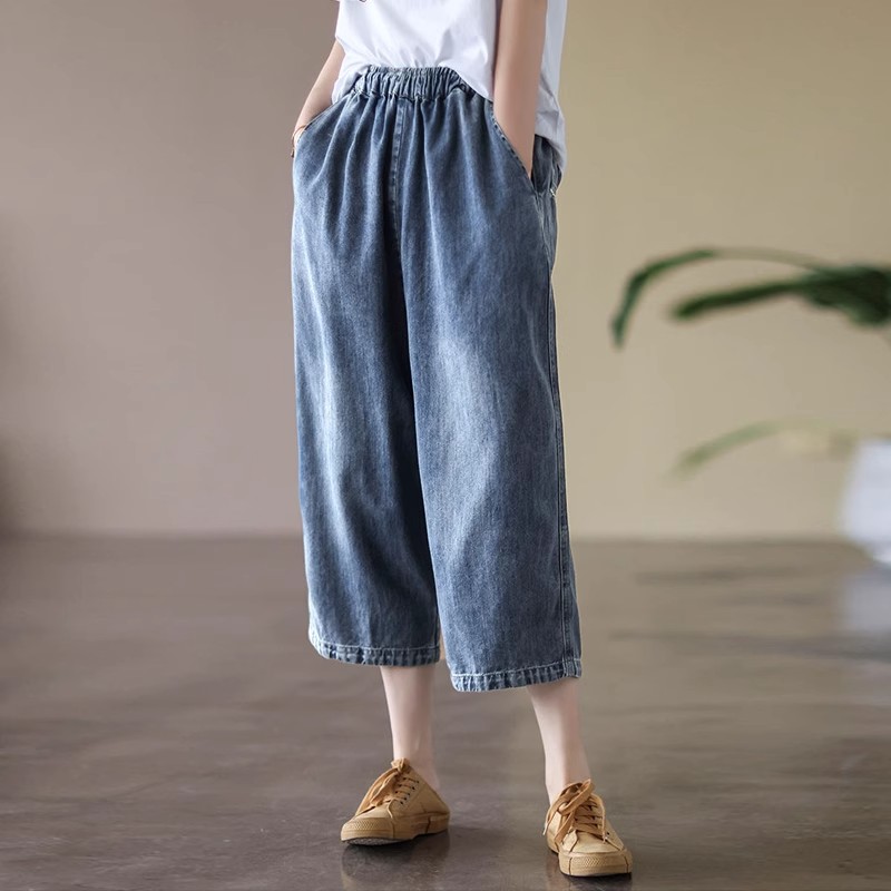 复古蓝色八分牛仔裤女夏季2025新款宽松高腰显瘦遮肉松紧腰阔腿裤