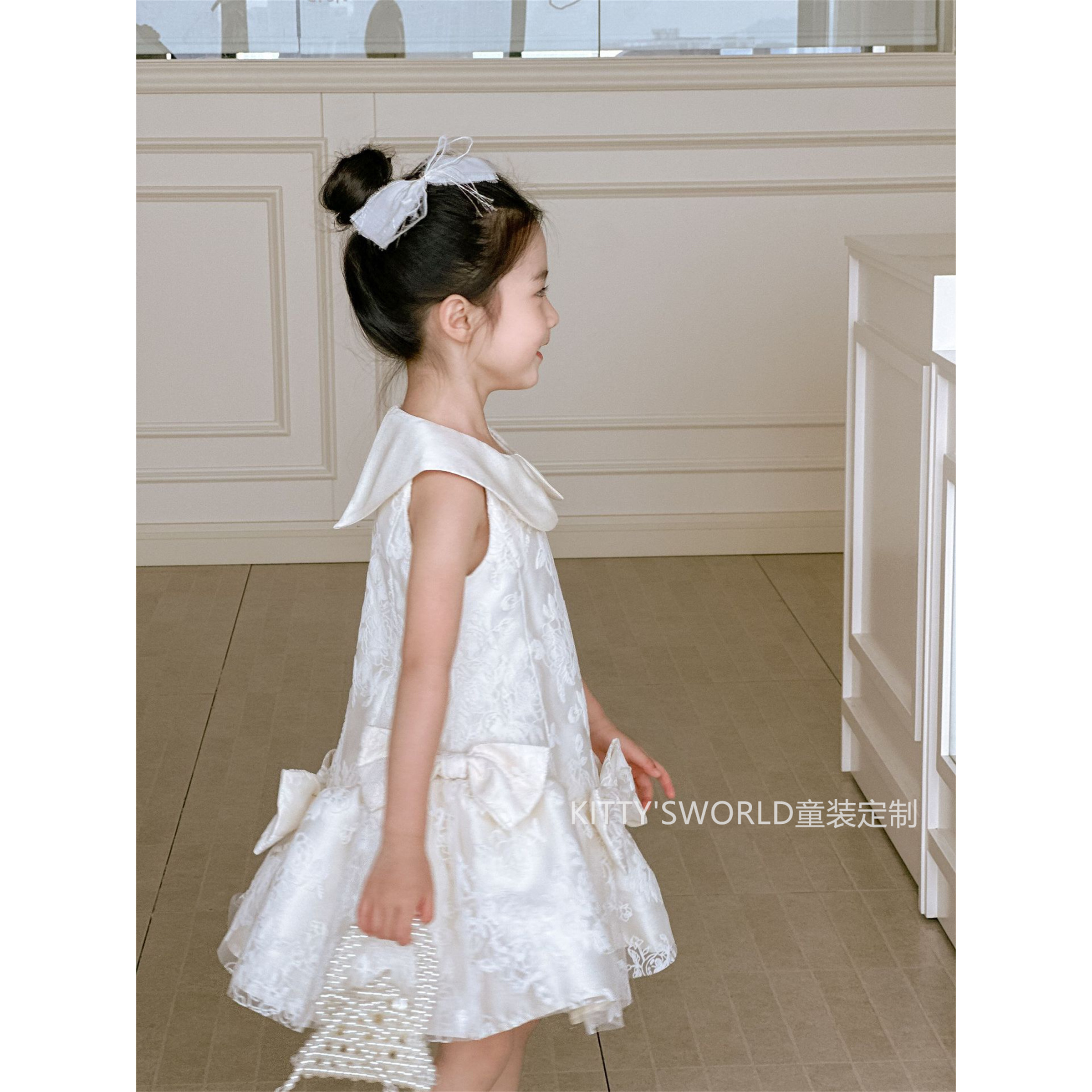 kw家女童白色生日公主裙秋冬蝴蝶结娃娃领背心裙蕾丝礼服裙连衣裙