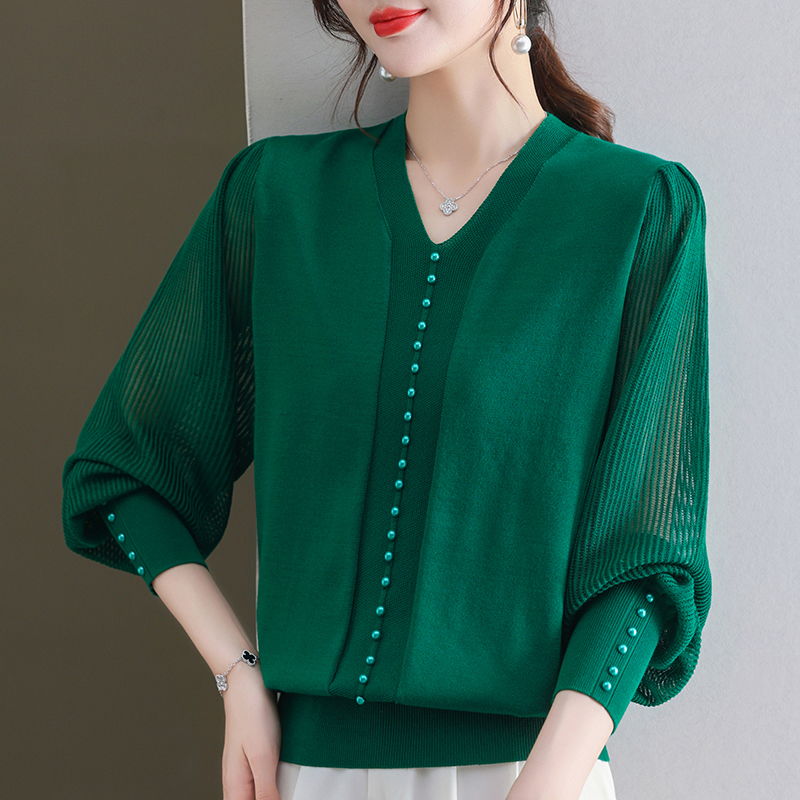 春夏季冰丝钉珠v领长袖镂空上衣