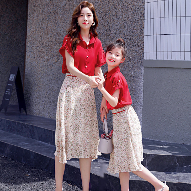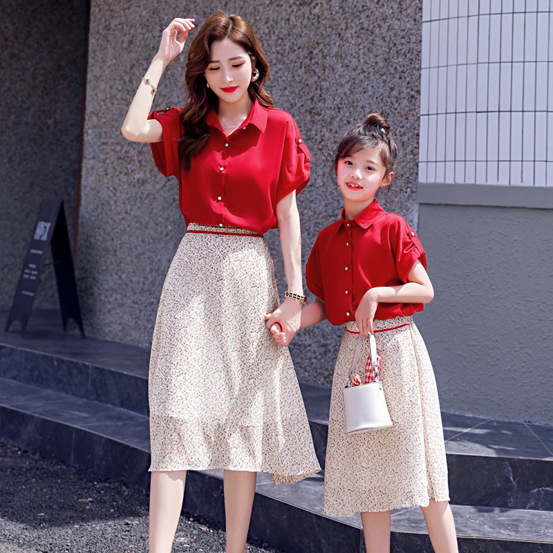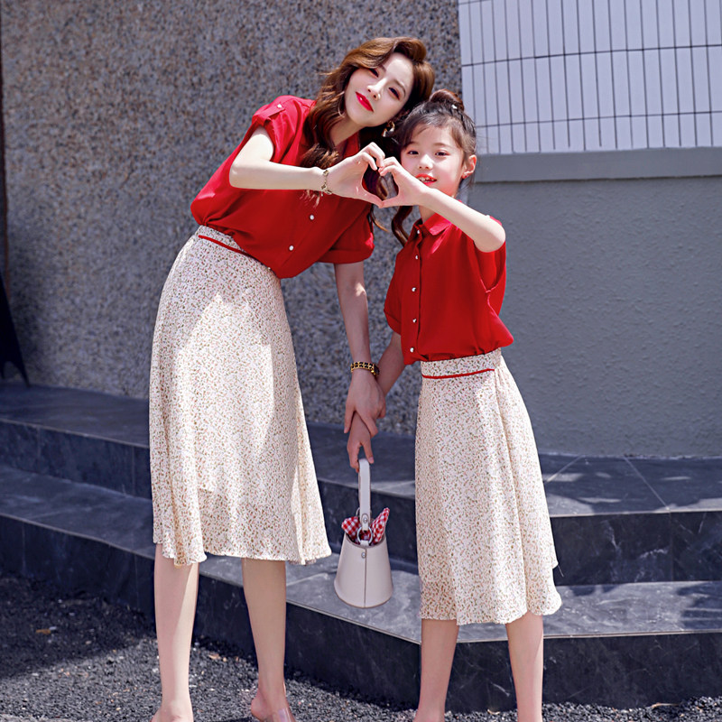 大红色网红炸街亲子装连衣裙套装2021夏装新款母女装洋气两件套潮