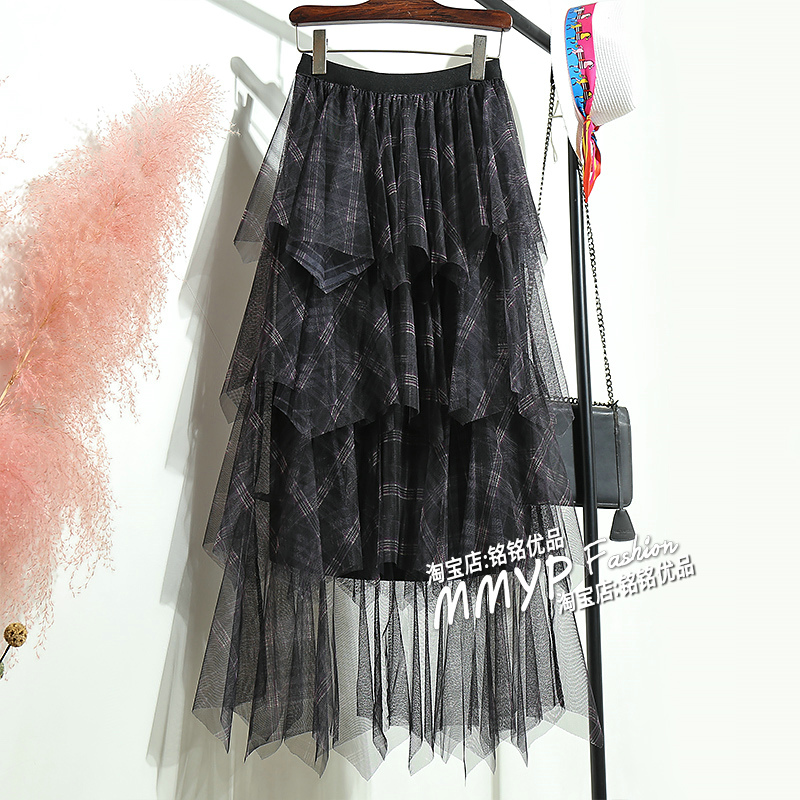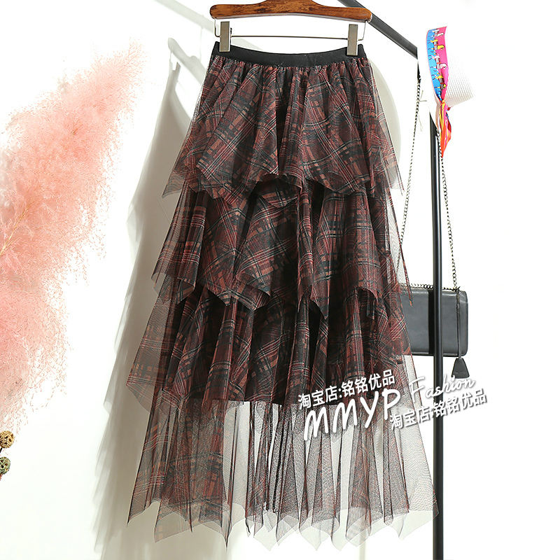 2025新款不规则纱裙网纱格子半身裙女冬季裙子高腰蛋糕裙长裙半裙