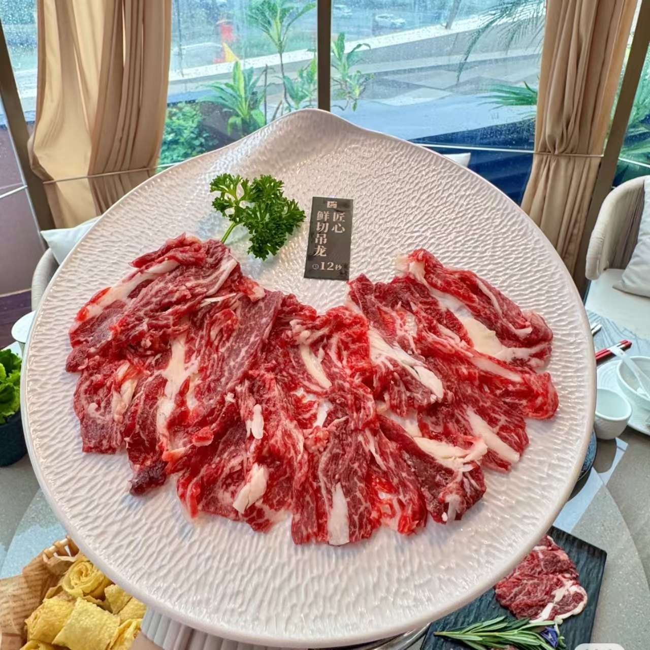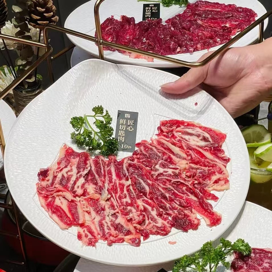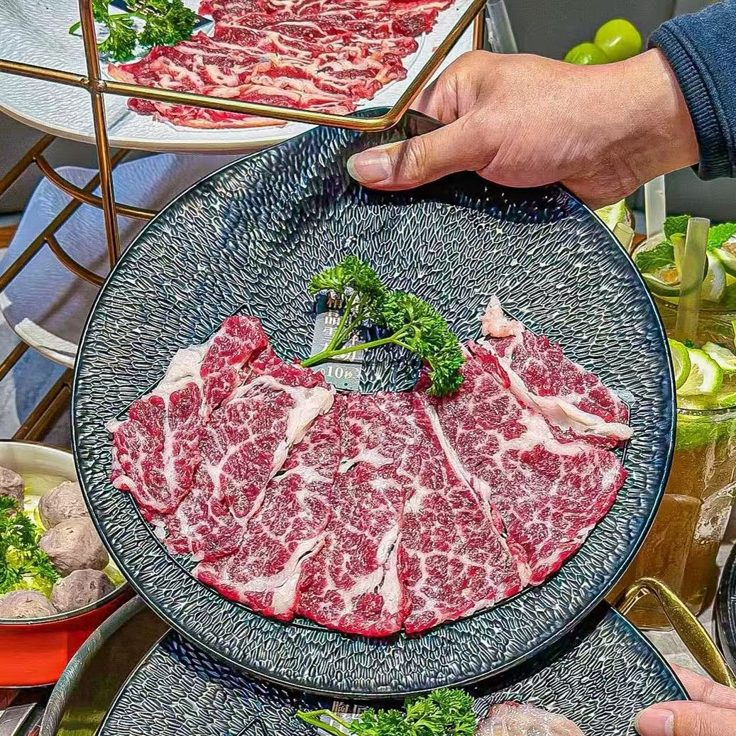 密胺仿瓷黑色圆盘八合里火锅店餐具现切鲜牛肉盘子肥牛盘雪花摆盘