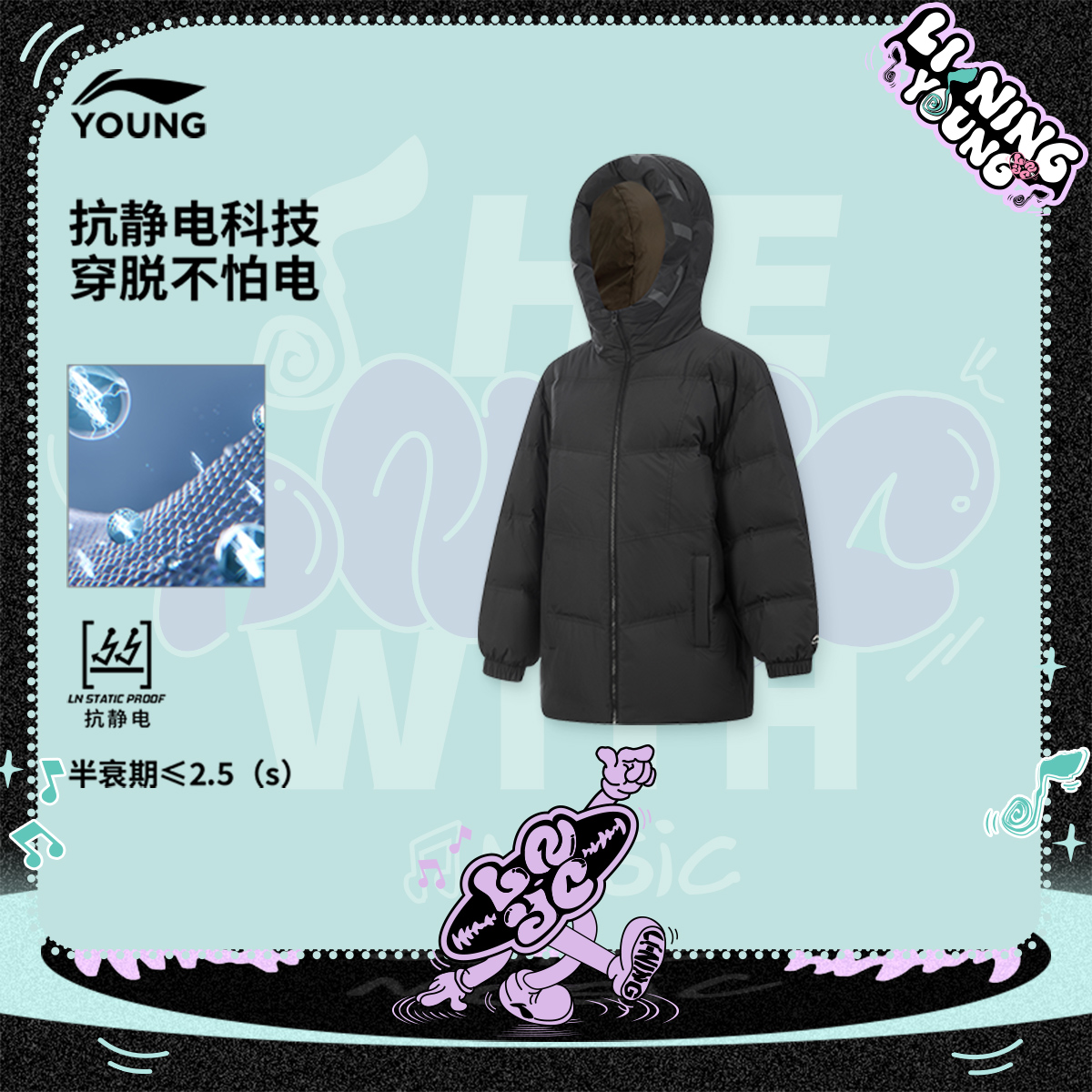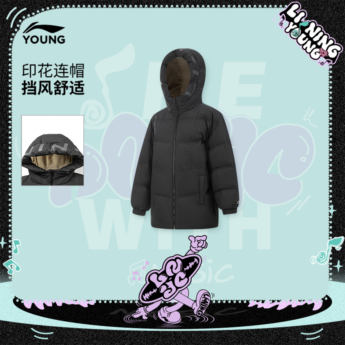 李宁童宽松连帽男女同款中羽绒服