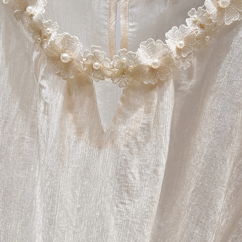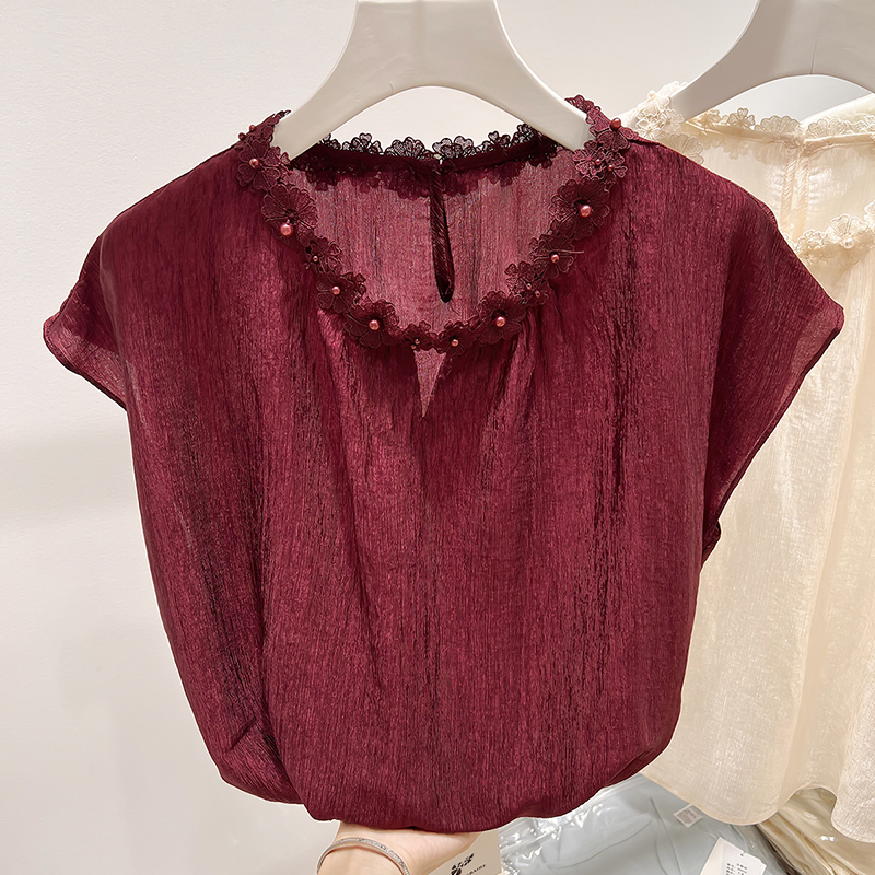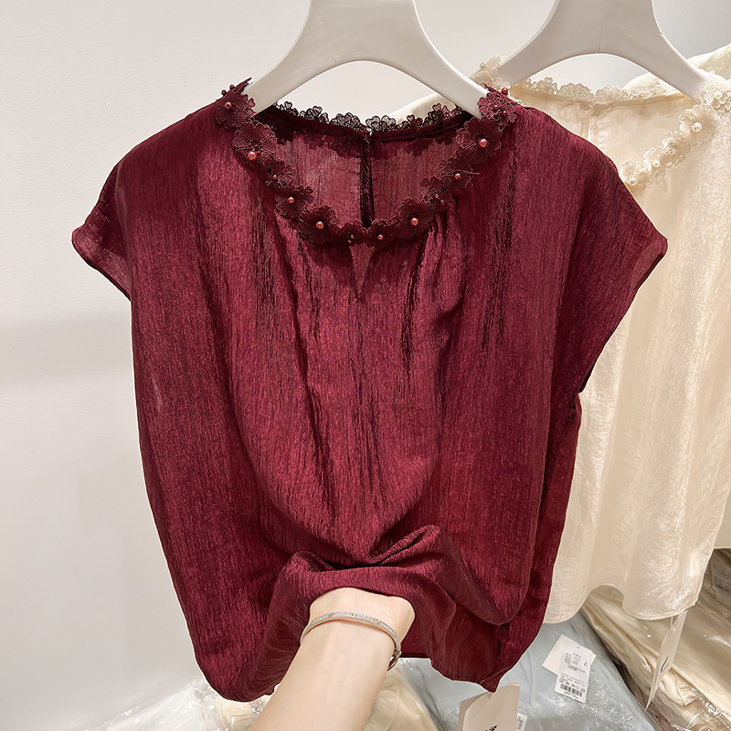 2025新款法式气质圆领花朵钉珠镂空纯色短袖雪纺衫女夏季薄款上衣