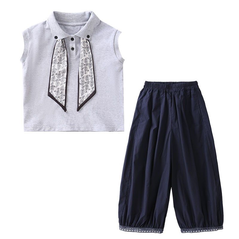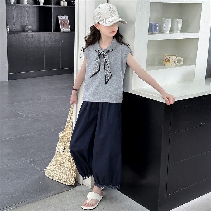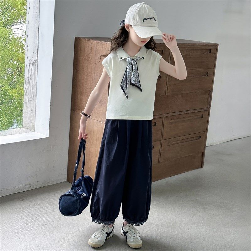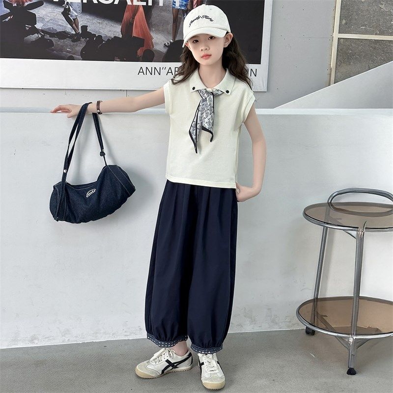 女童夏装套装大童洋气纯棉宽x松休闲儿童短袖翻领T恤阔腿裤两件套