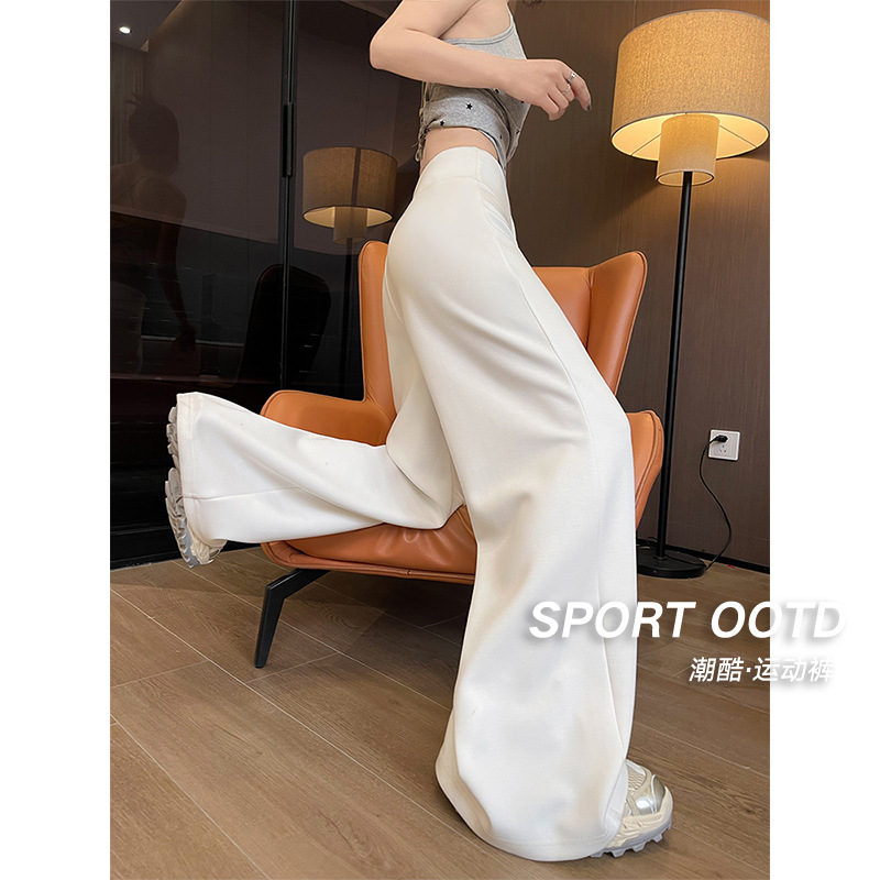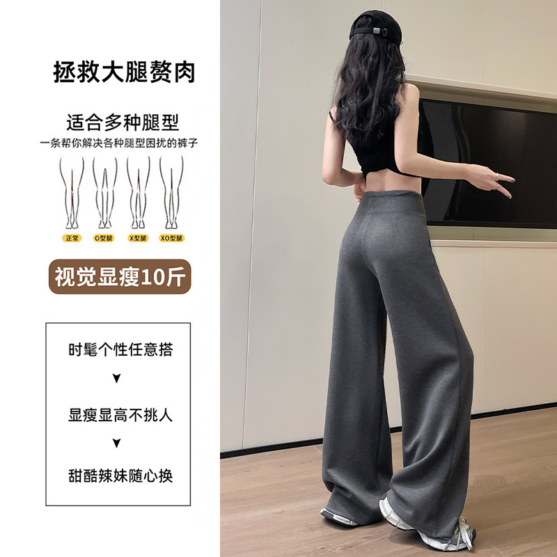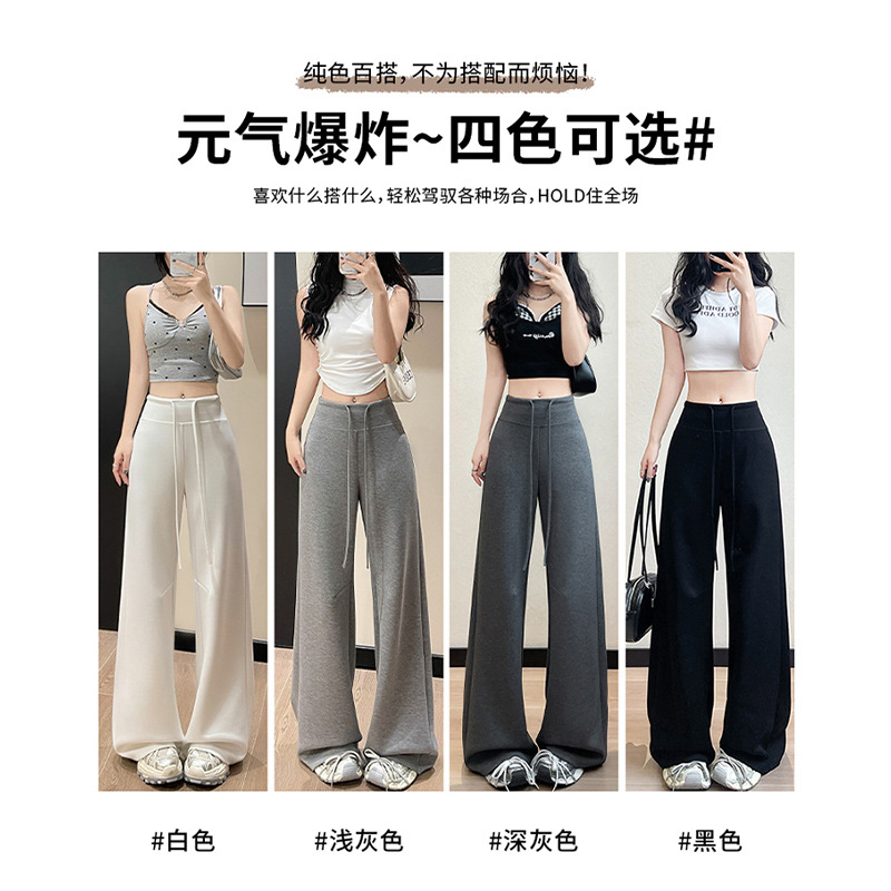 抽绳高腰休闲裤女夏季浅灰色直筒宽松显瘦阔腿拖地长裤大学生