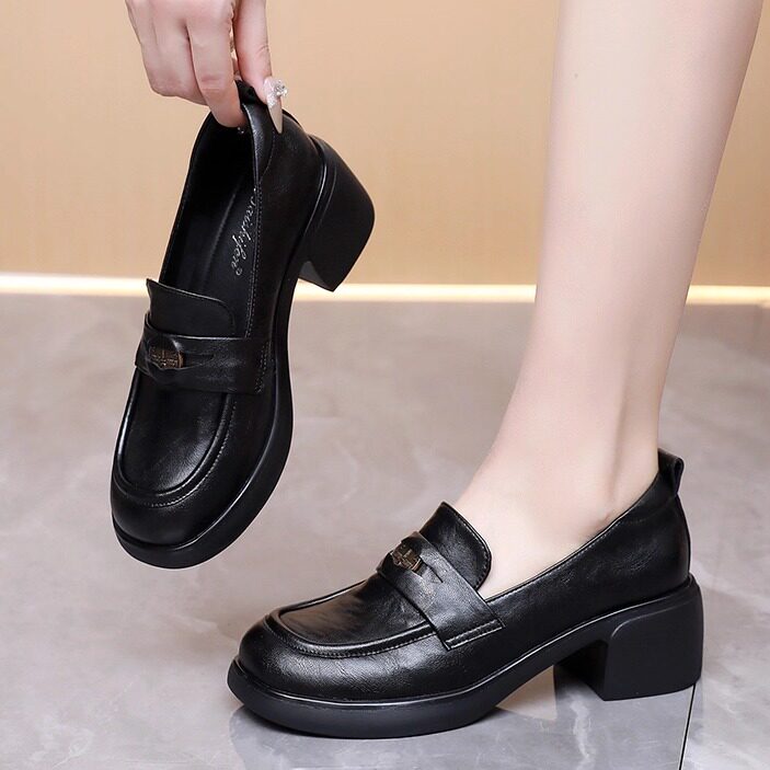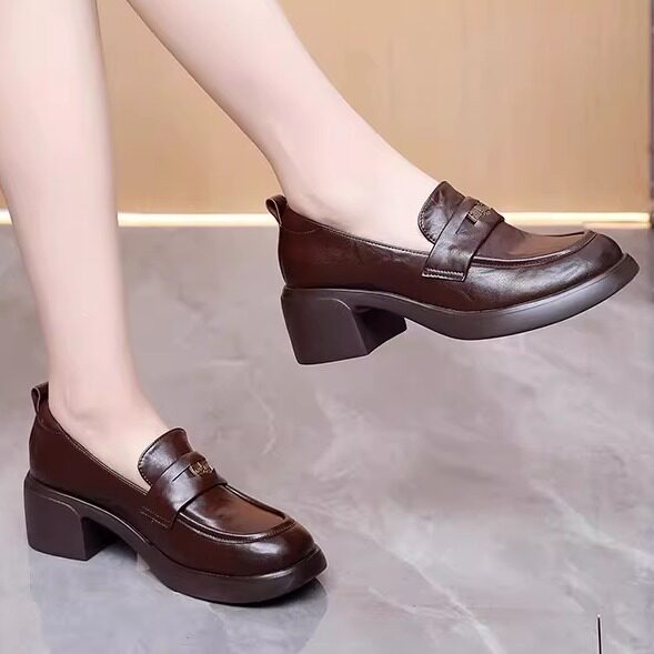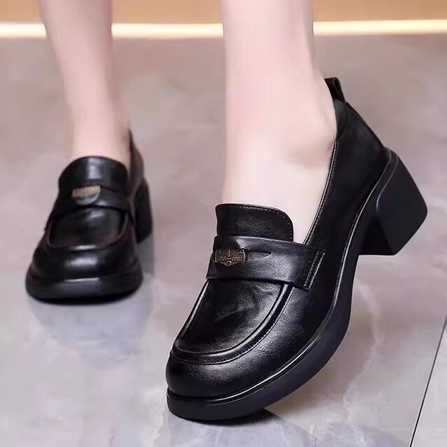 真皮厚底单鞋女一脚蹬英伦风乐福鞋新款春秋季高跟圆头小皮鞋大码