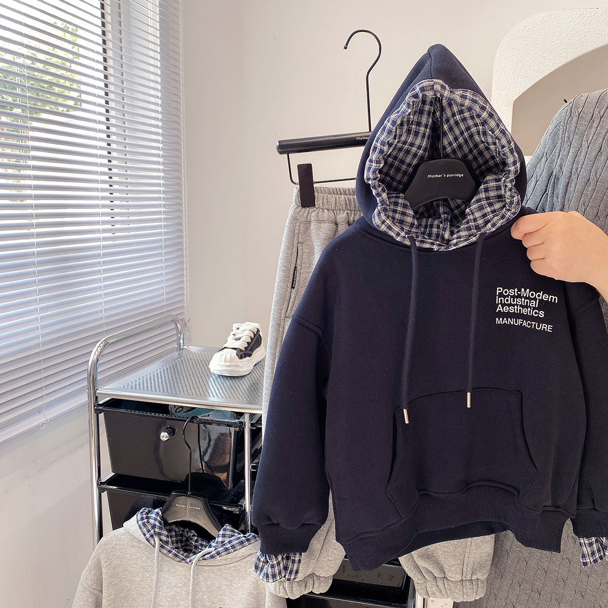 【水洗棉亲肤格子】男童加绒卫衣中童拼接袖加厚套头上衣儿童帽衫