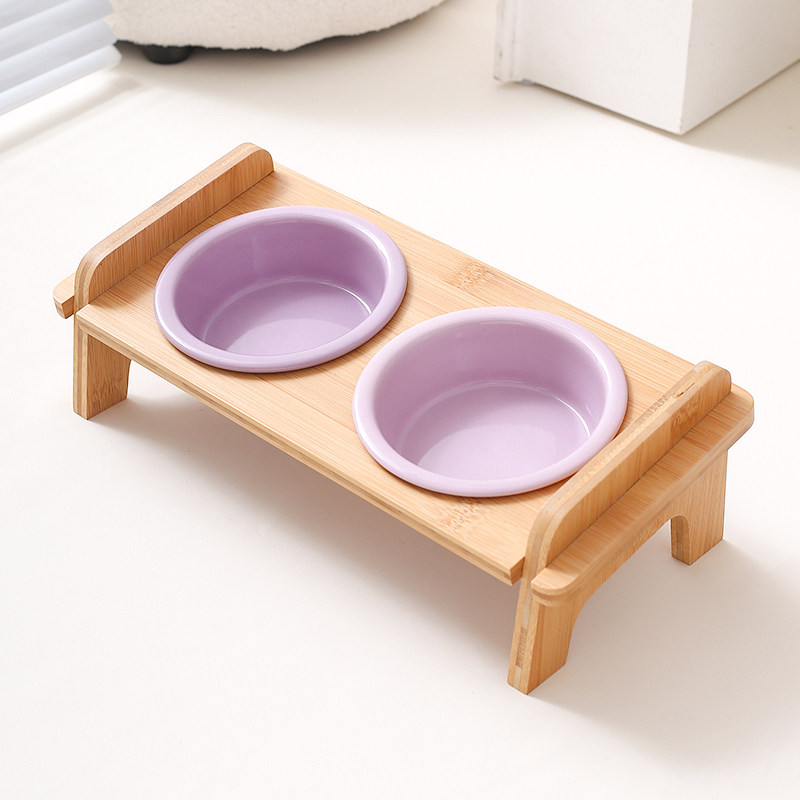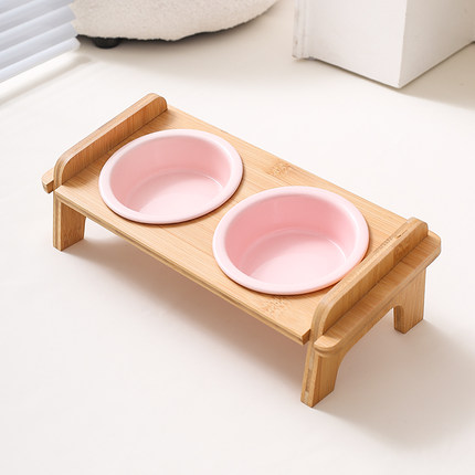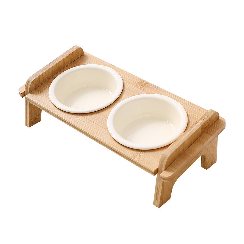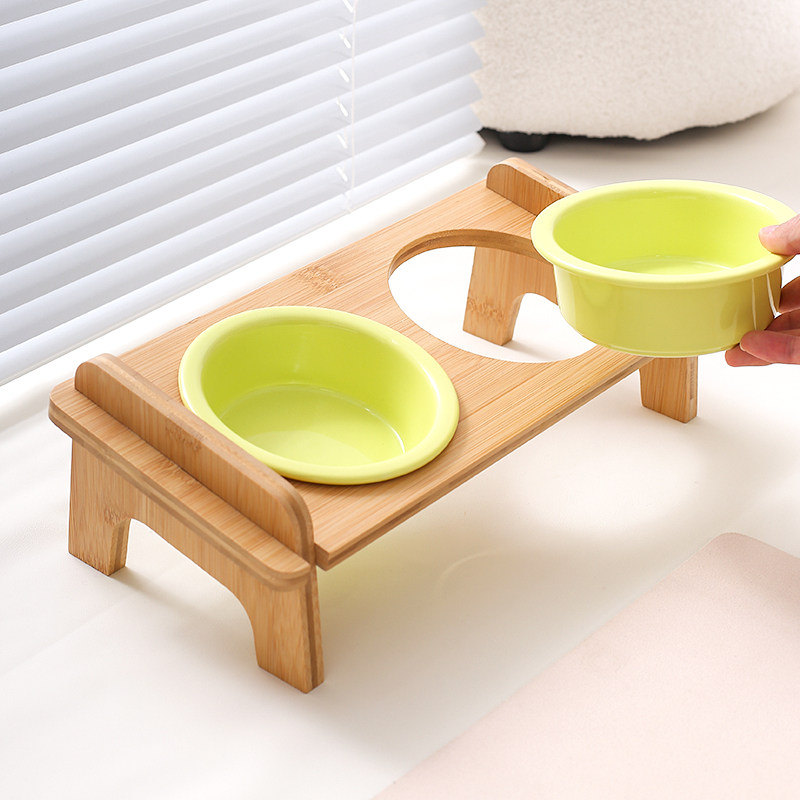 玛特利奶油风陶瓷猫碗木架斜口双碗架猫食盆狗碗防打翻猫狗喝水碗