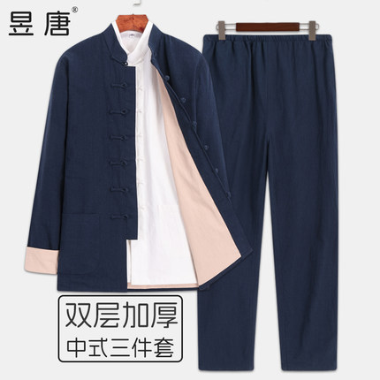 中式唐装春秋长袖套装复古风国潮男装棉麻立领盘扣茶服居士禅修服