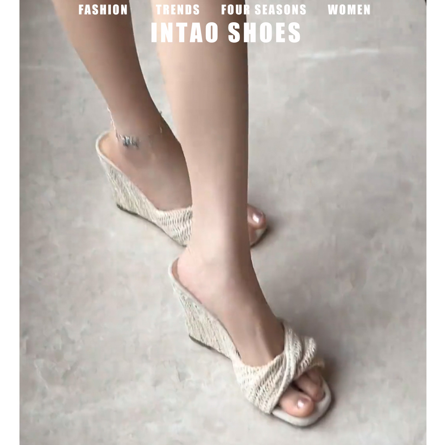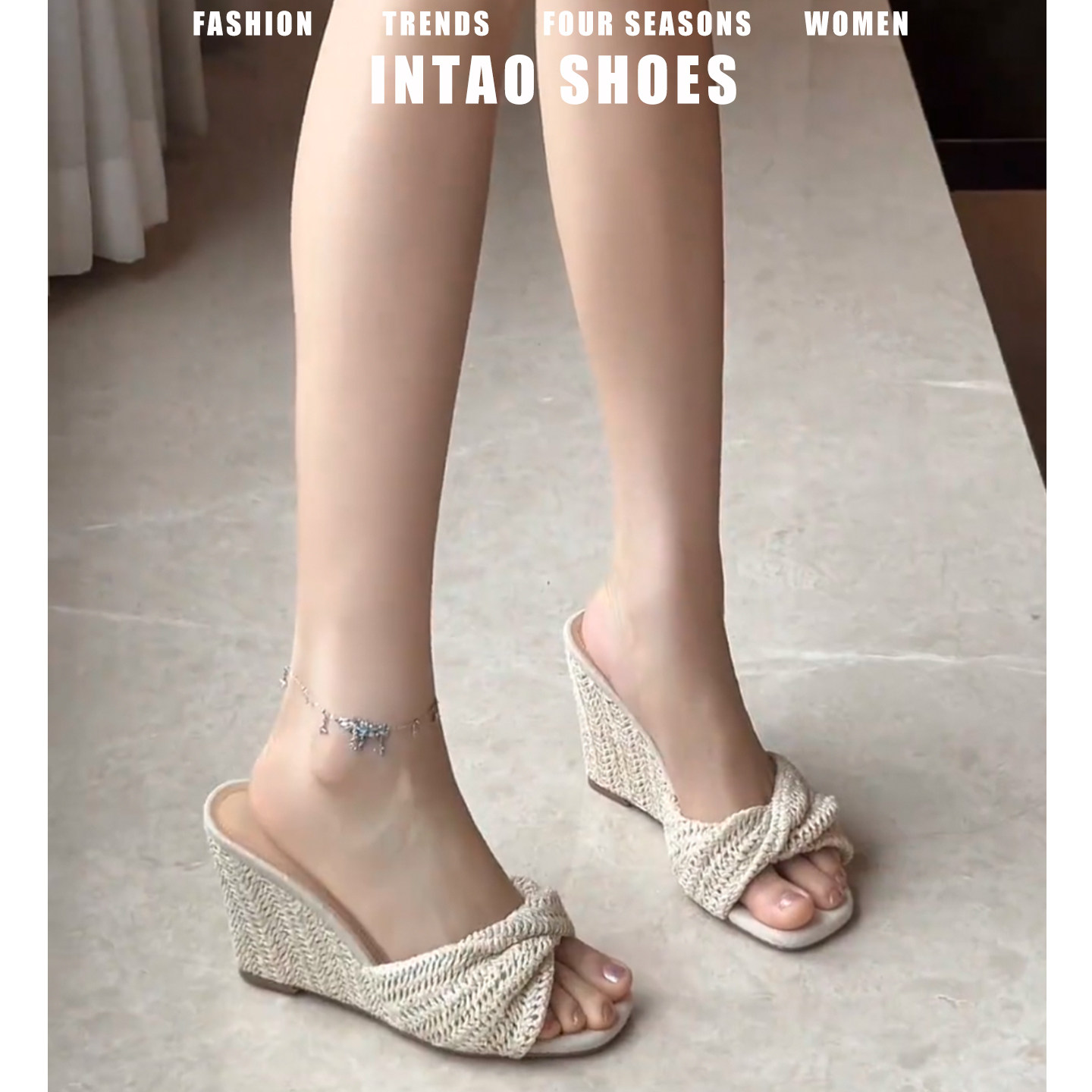 度假风~编织拖鞋女夏外穿2026新款绝美露趾凉拖不累脚坡跟高跟鞋