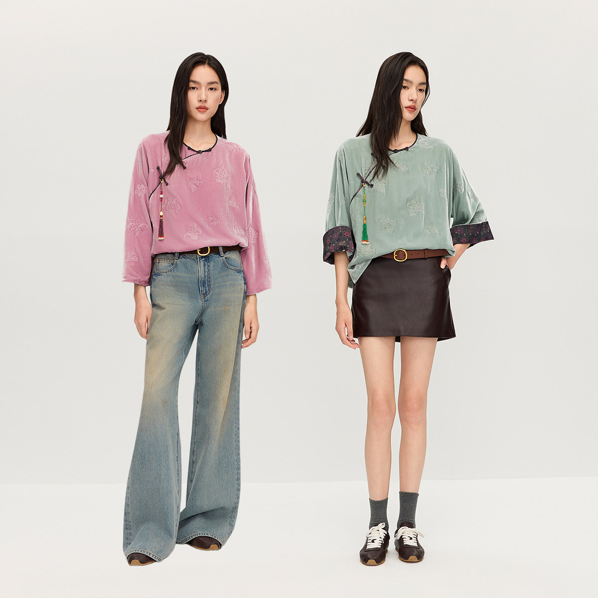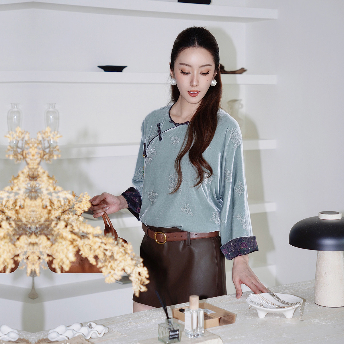 【新品】OCHIRLY欧时力真丝哑光丝绒刺绣新中式衬衫盘扣挂链25冬