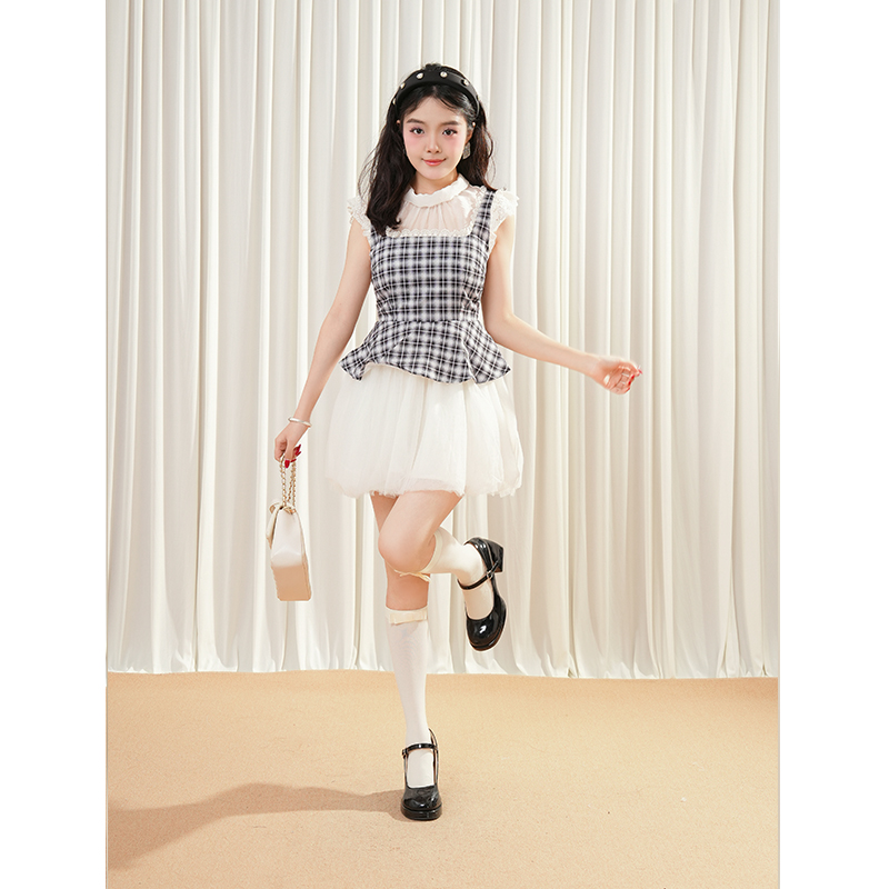 格雷系千金 夏季新款法式赫本风设计感格纹拼接收腰蓬蓬连衣裙女