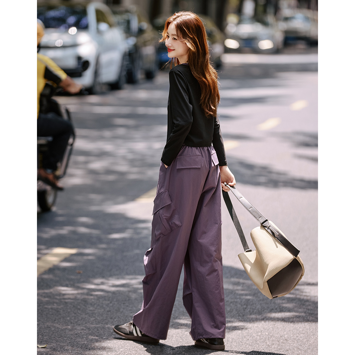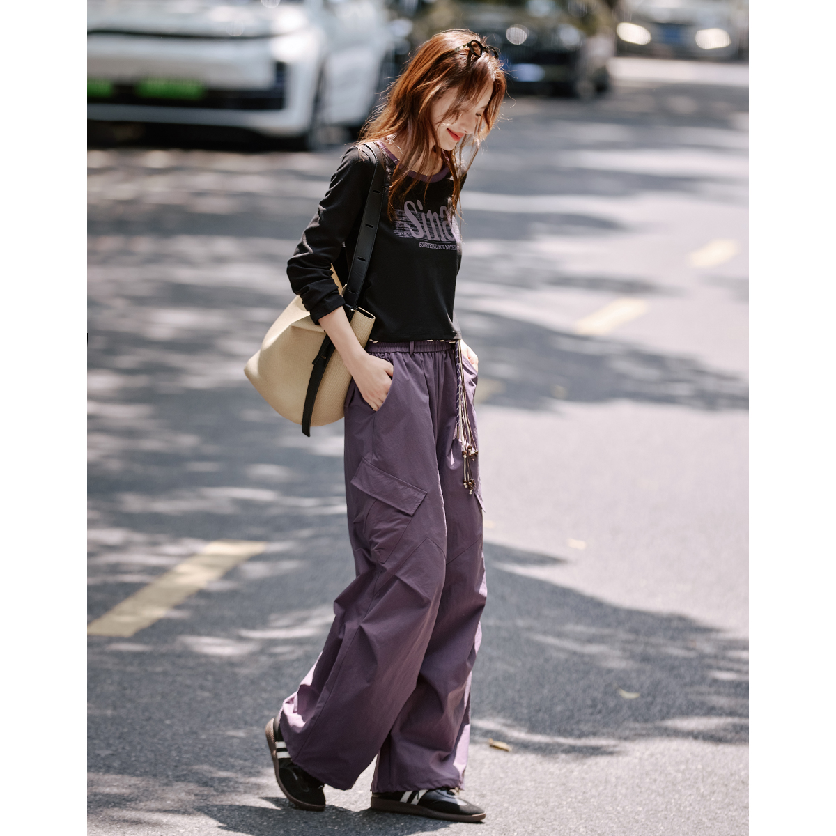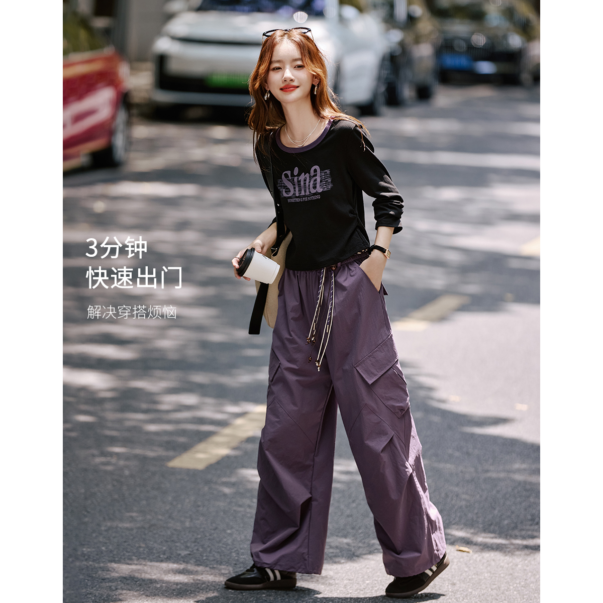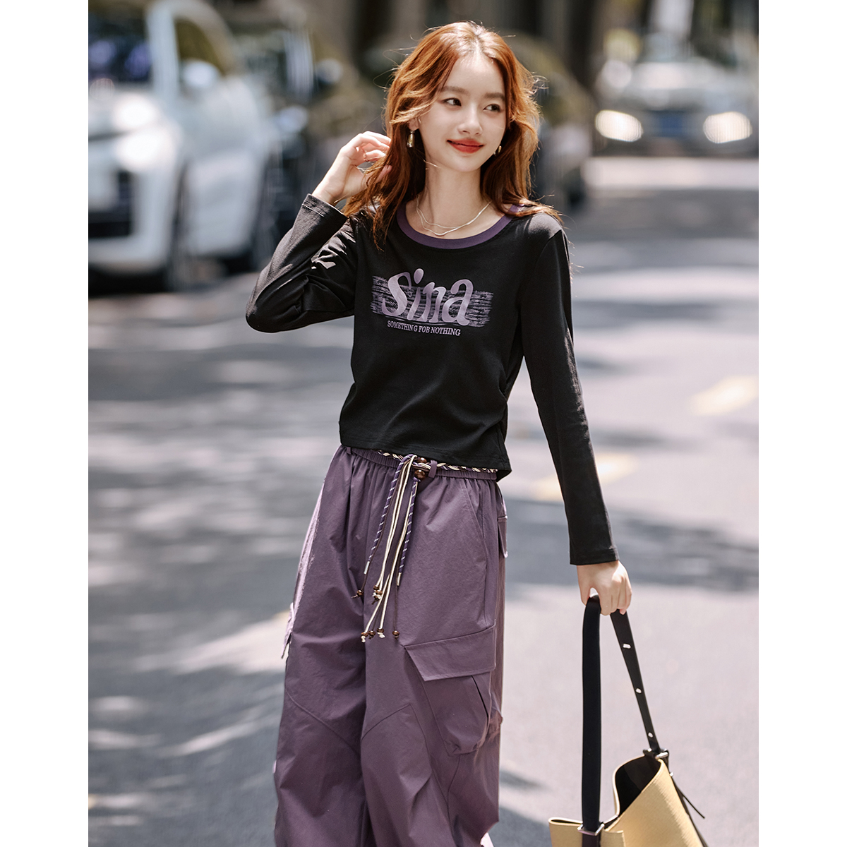 工装裤套装女2025春秋新款字母印花圆领短上衣直筒阔腿裤二件套