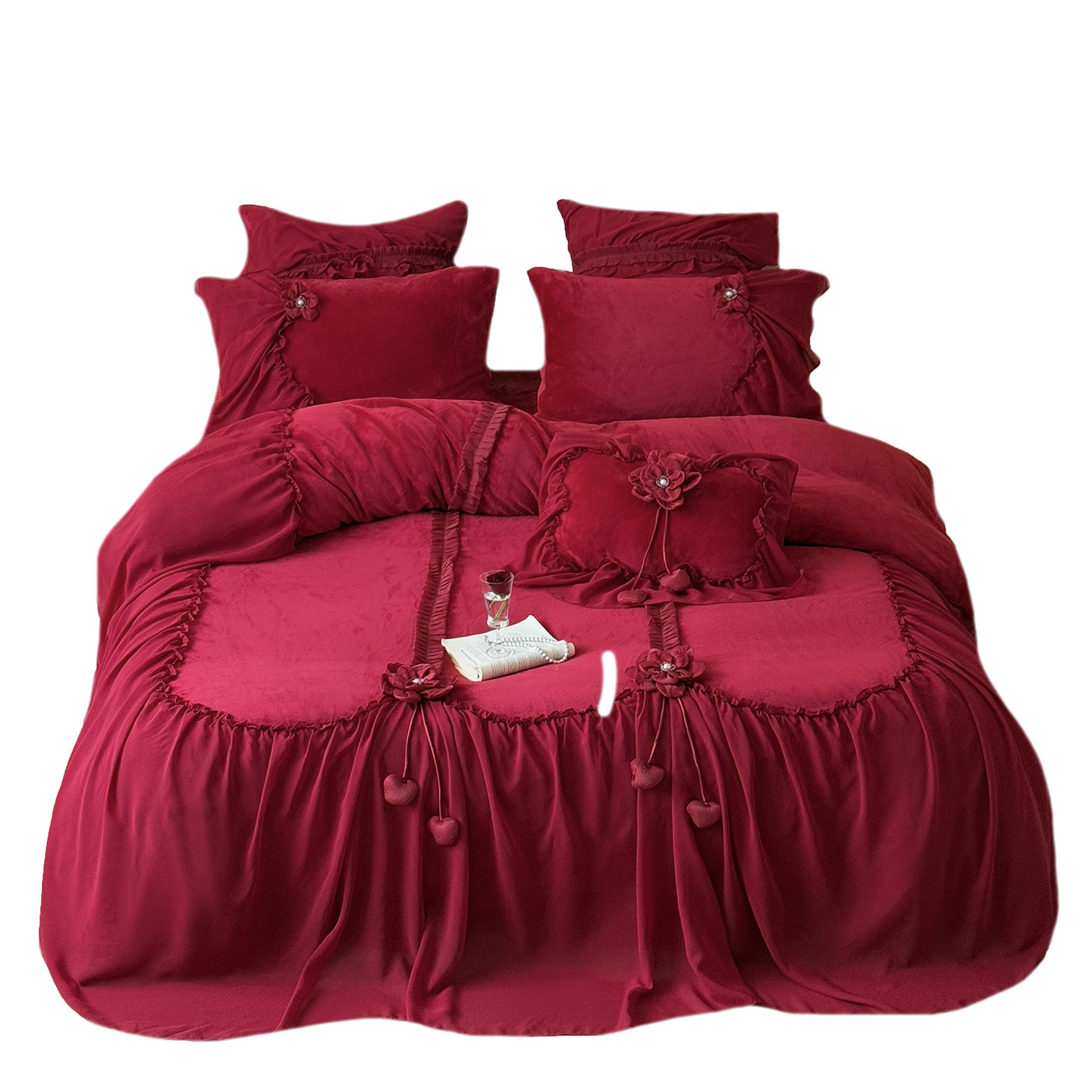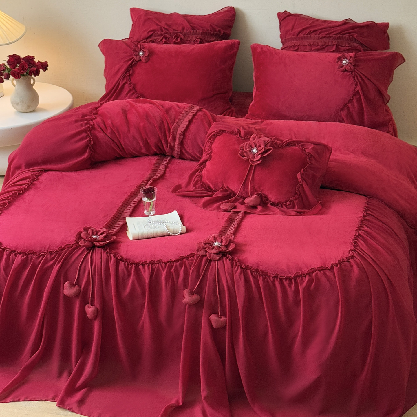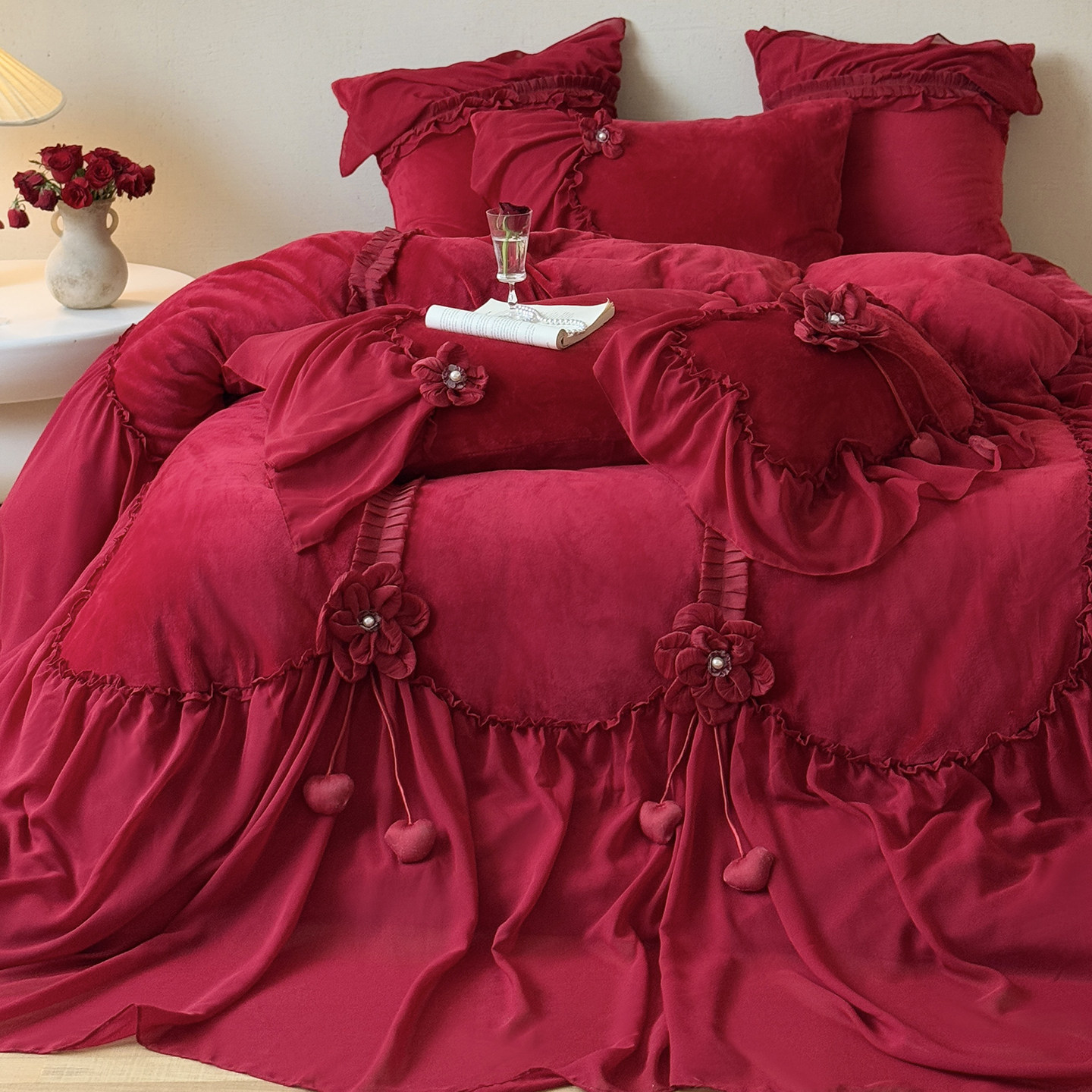法式复古红色牛奶绒四件套公主风立体花朵珊瑚绒加绒被套婚庆冬季