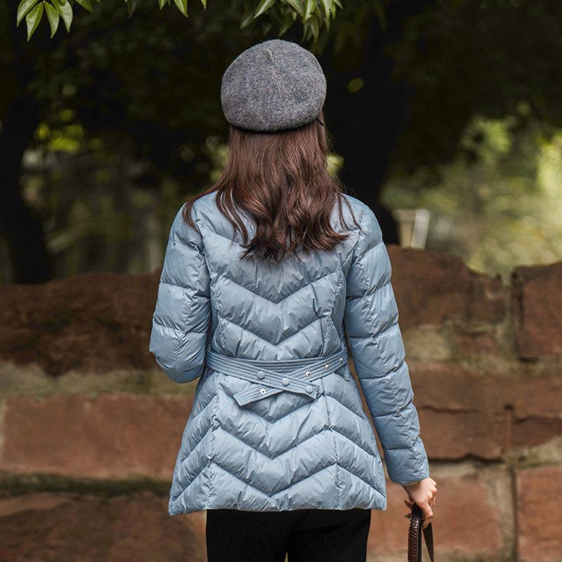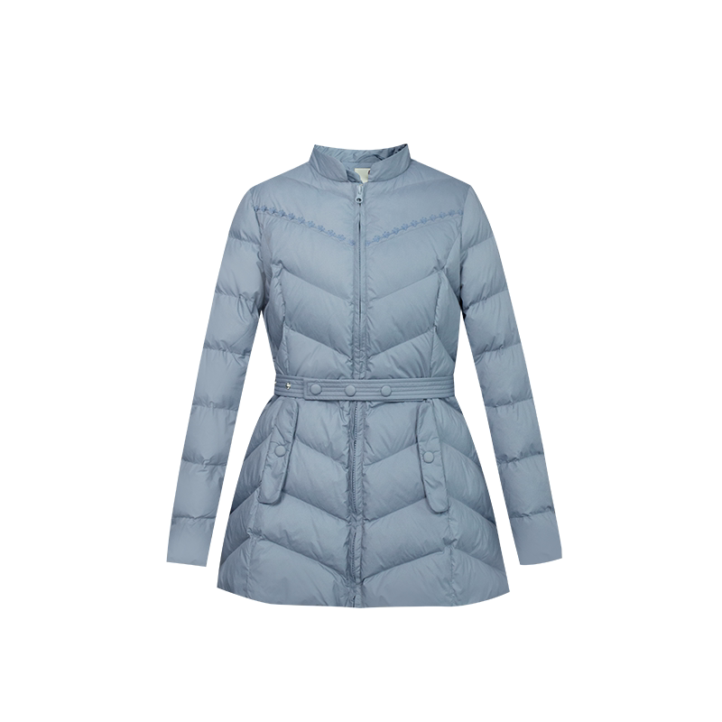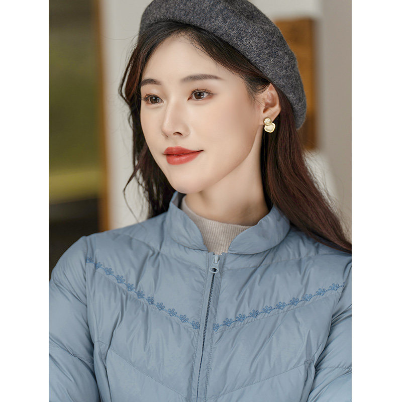 蓝色刺绣轻中式立领中长羽绒棉服