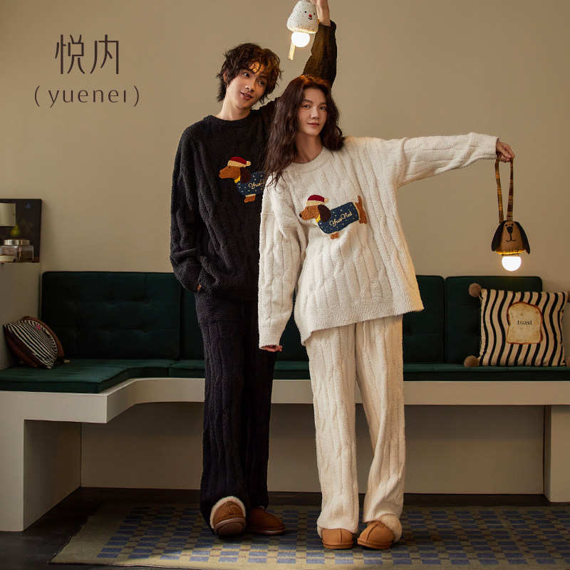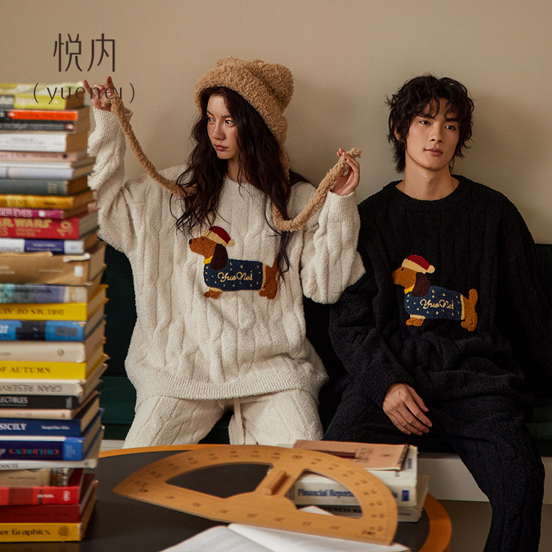 悦内情侣半边绒睡衣女款冬季珊瑚绒加厚毛绒家居服男士大码可外穿