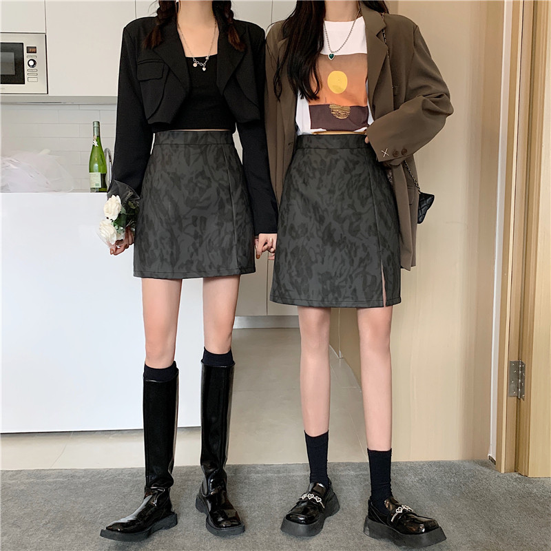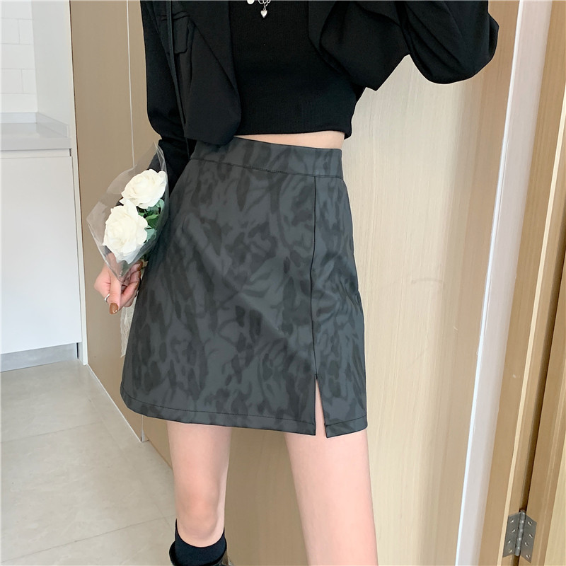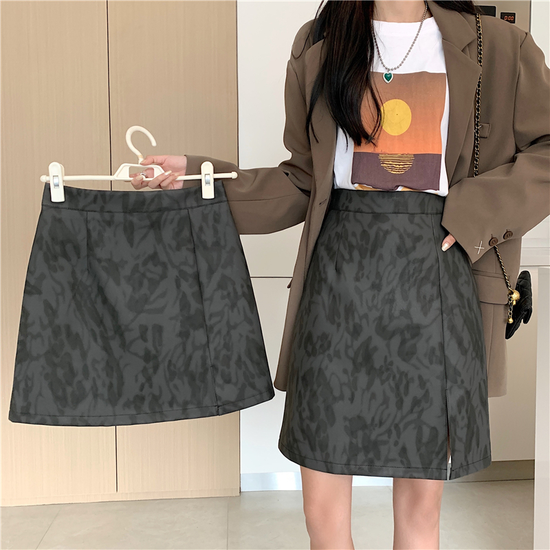 大码复古PU皮裙豹纹短裙女秋冬高腰a字半身裙中长款开叉包臀裙子