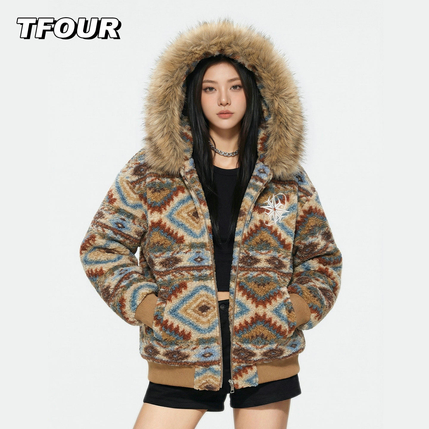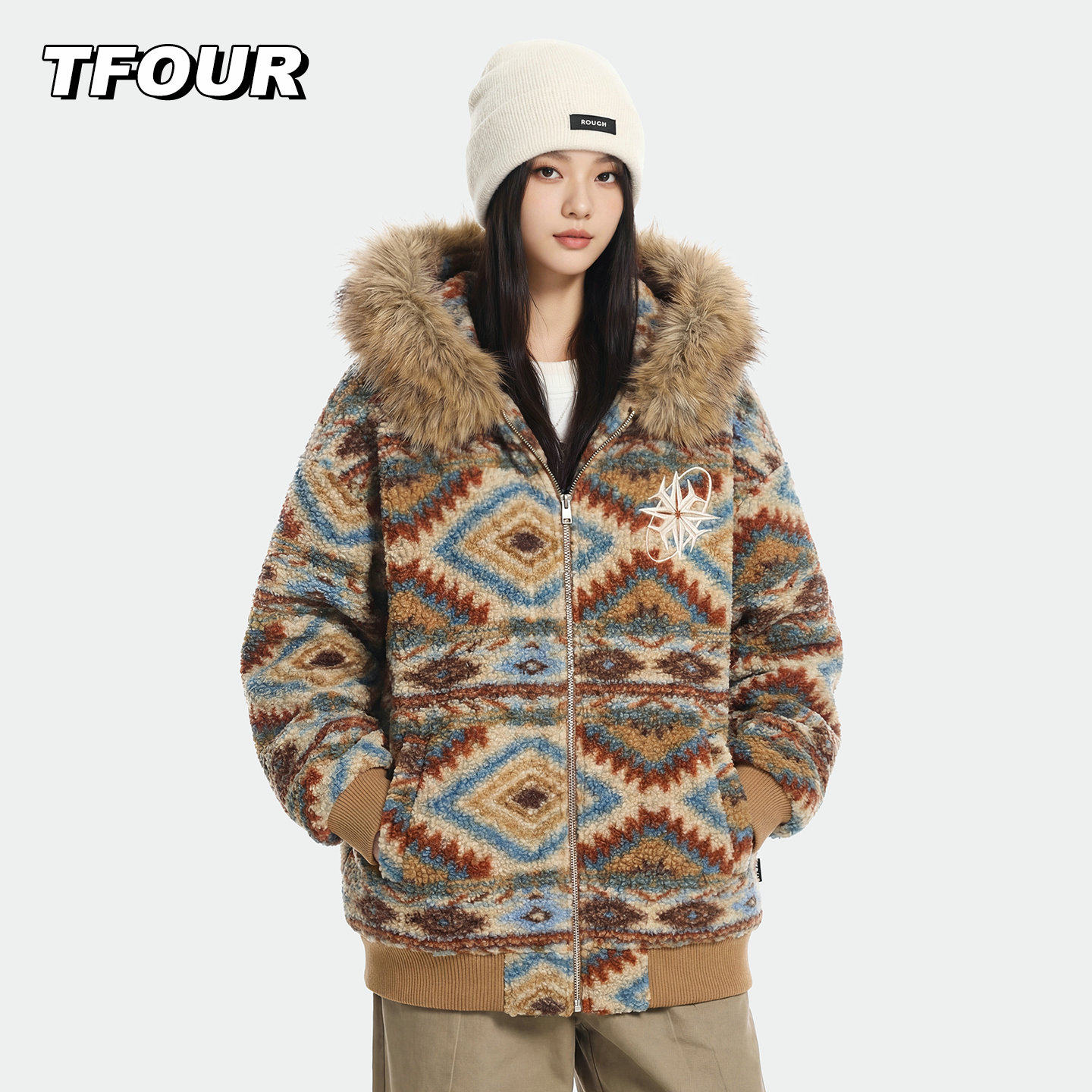 TFOUR 加厚保暖毛领棉衣男女2025新款冬季潮流复古八芒星夹棉外套