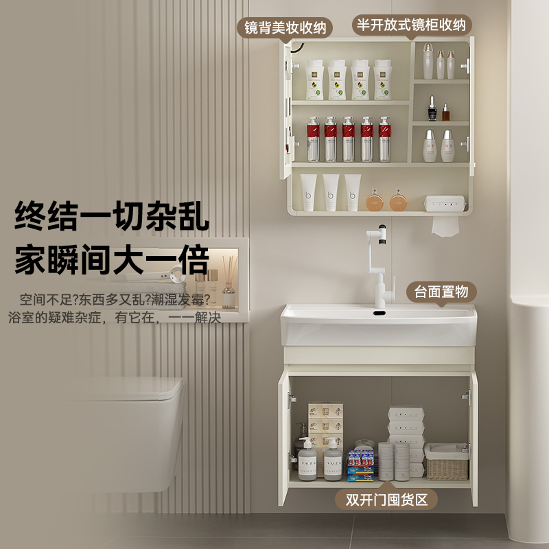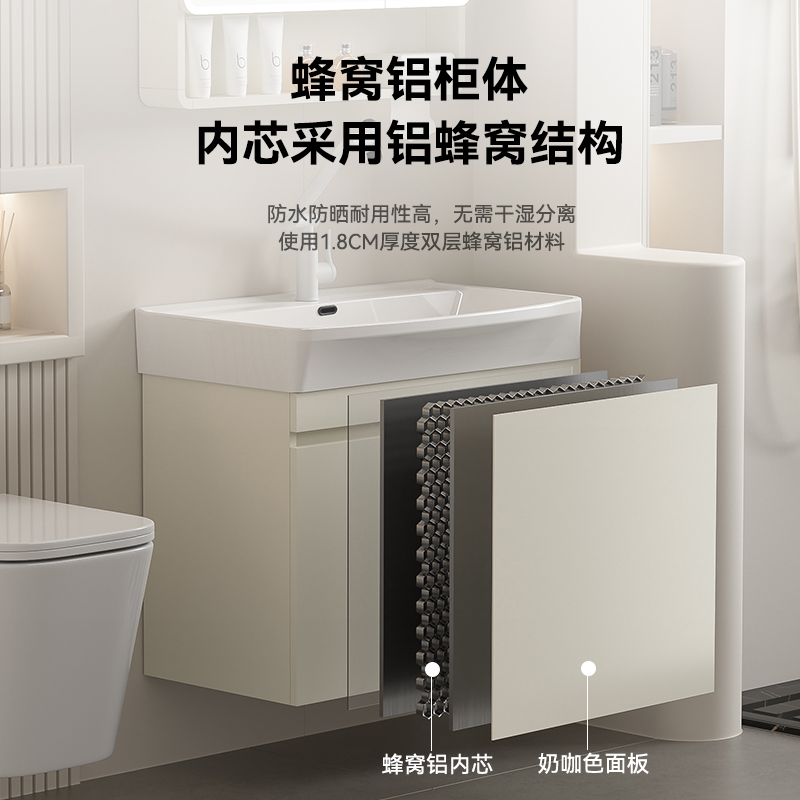 奶油风挂墙加厚蜂窝铝浴室柜洗手盆组合卫生间带搓衣板陶瓷洗衣盆
