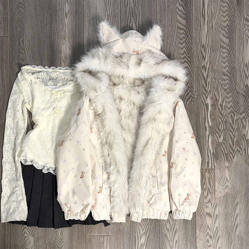 冬日气质温柔风小狗印花双面穿连帽棉服女学生宽松保暖座山雕外套