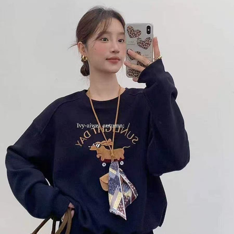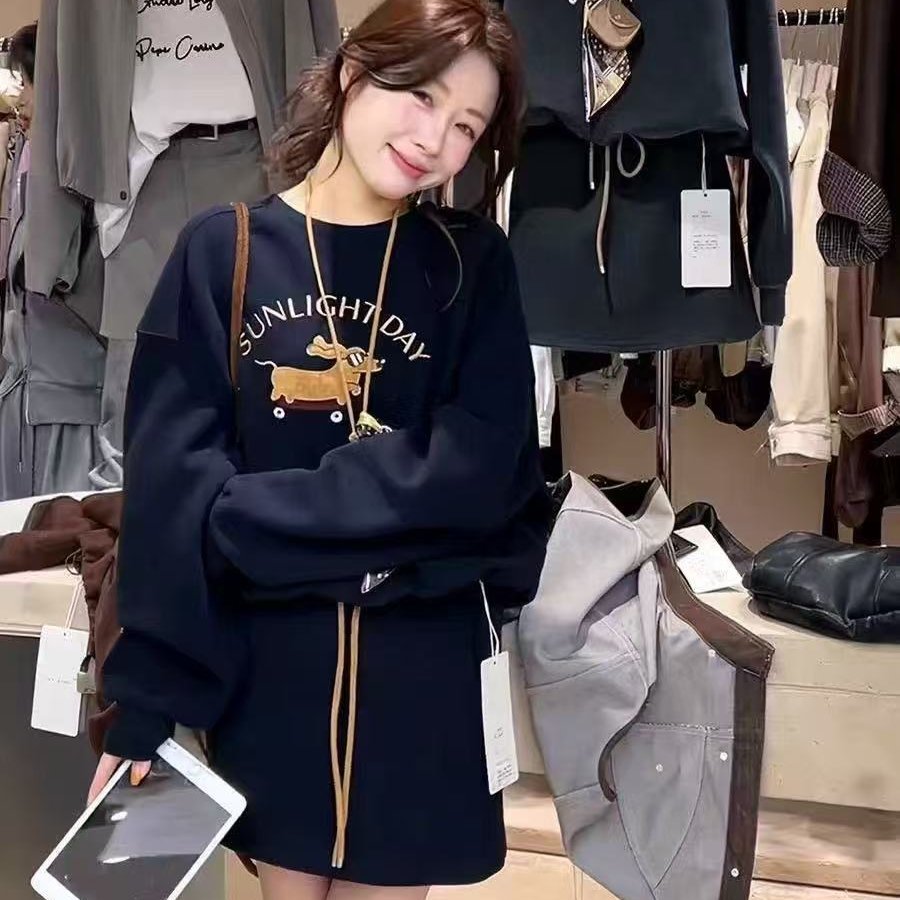 韩版百搭休闲卡通狗字母印花卫衣+松紧腰半身裙+挂饰3件套