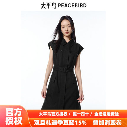 太平鸟工装衬衫领收腰连衣裙女2025秋季新款短袖腰带黑色通勤短裙