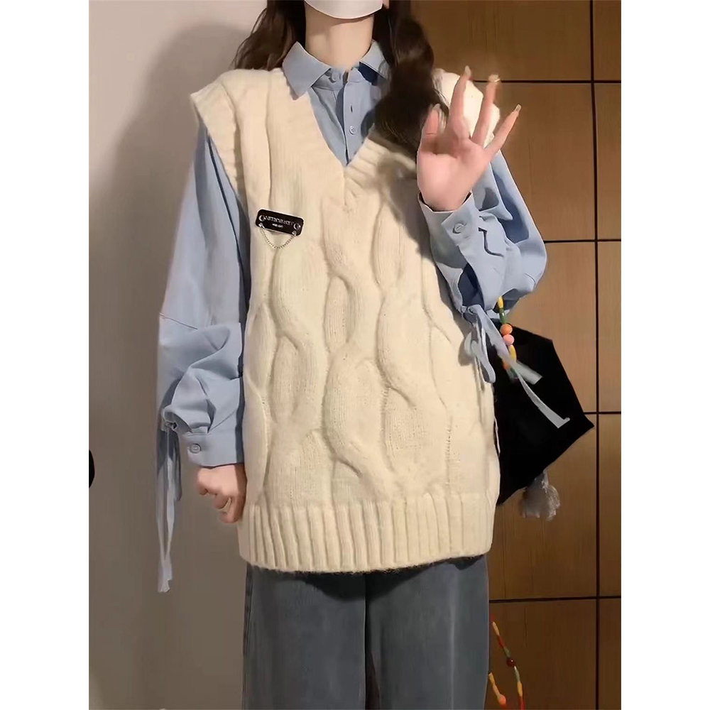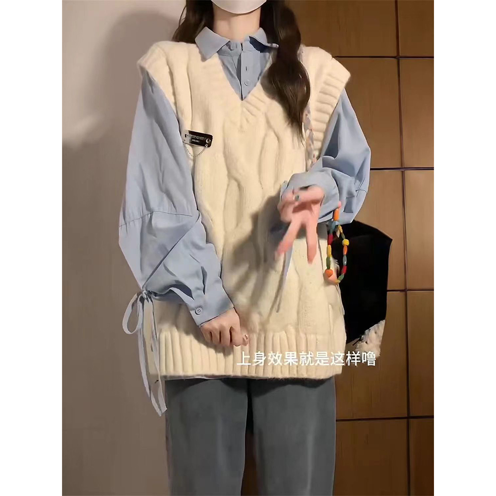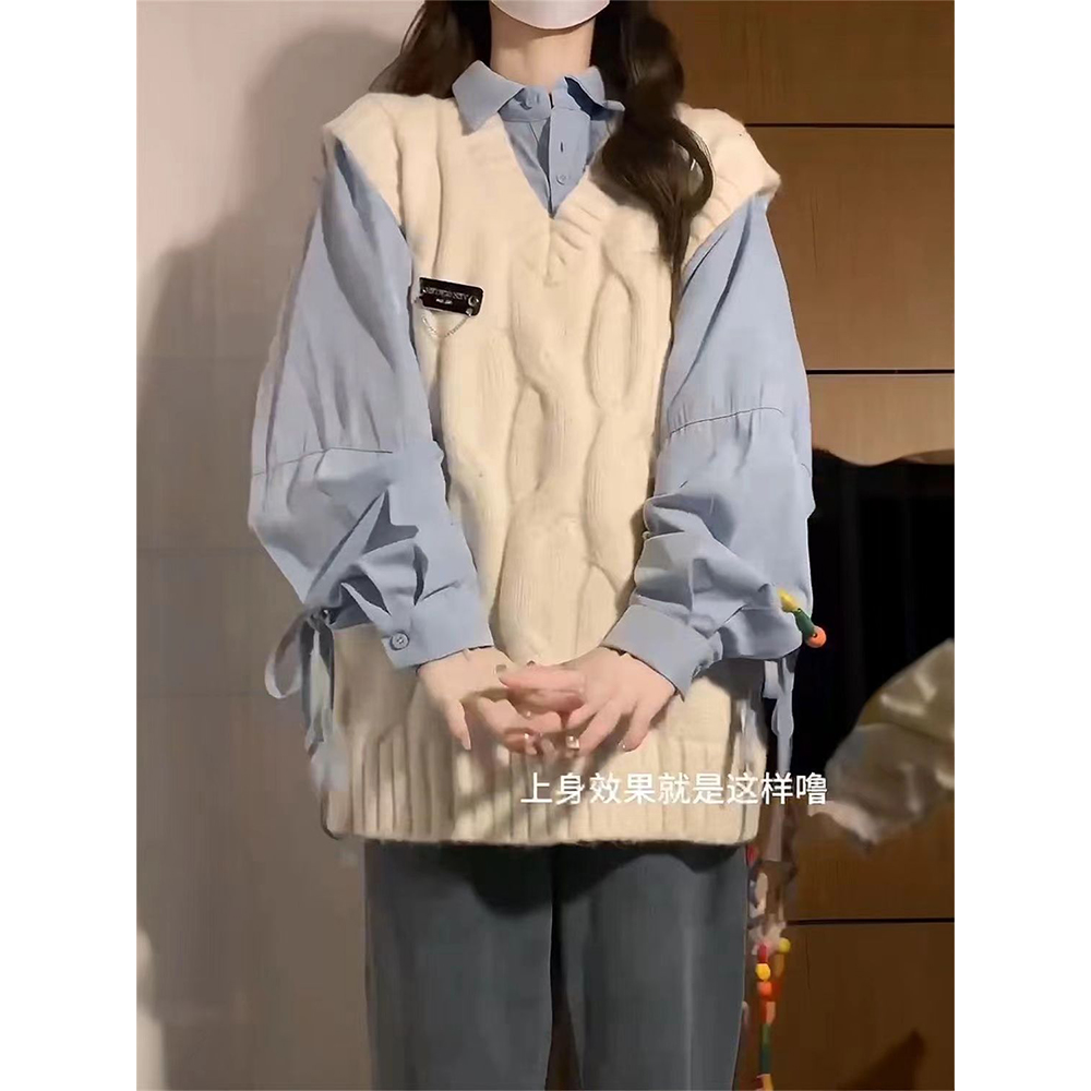 套装/单件韩系学院风蓝色毛衣背心秋季女学生马甲+长袖绑带衬衫潮