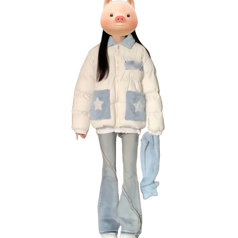 多巴胺可爱毛绒围巾棉服女休闲百搭白色拼接闺蜜款保暖棉衣面包服
