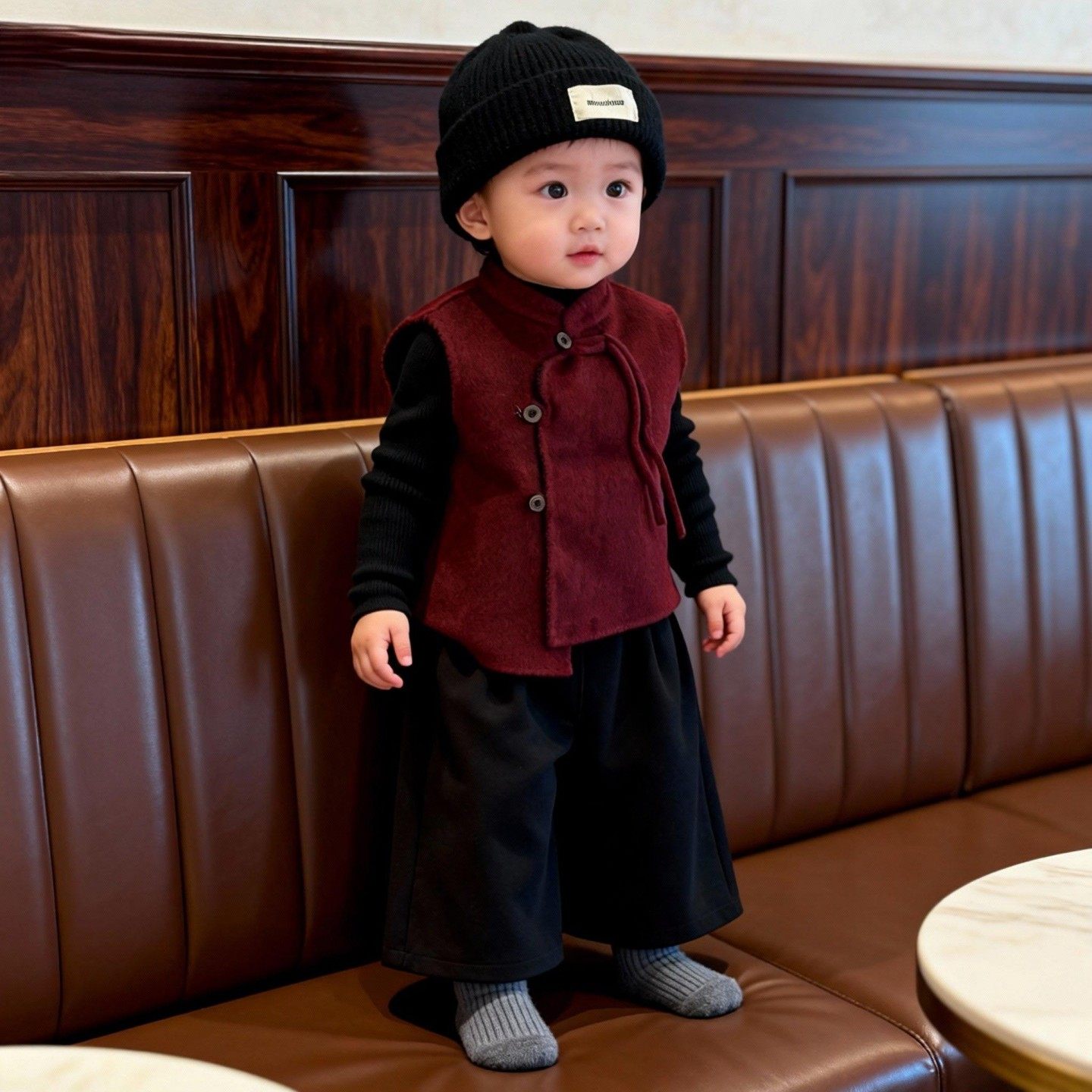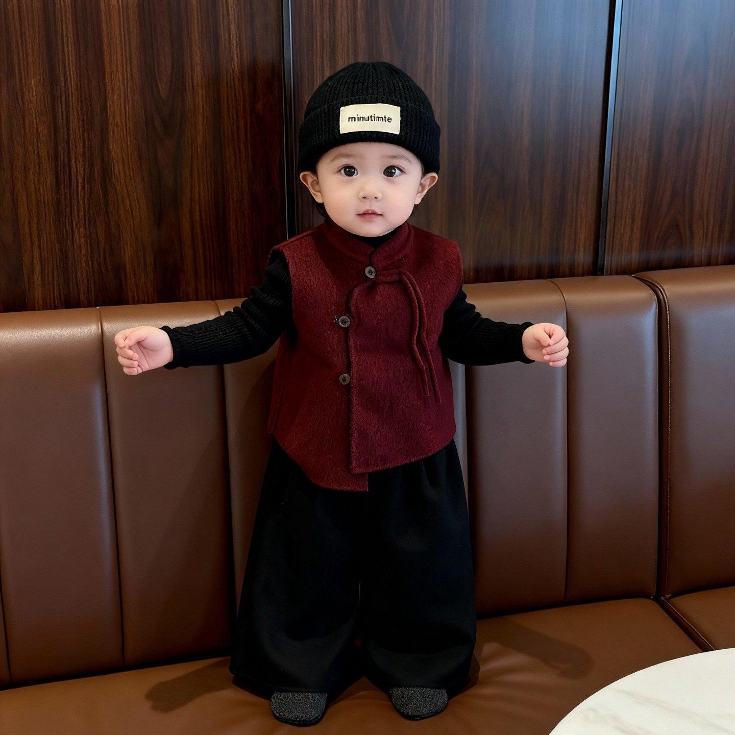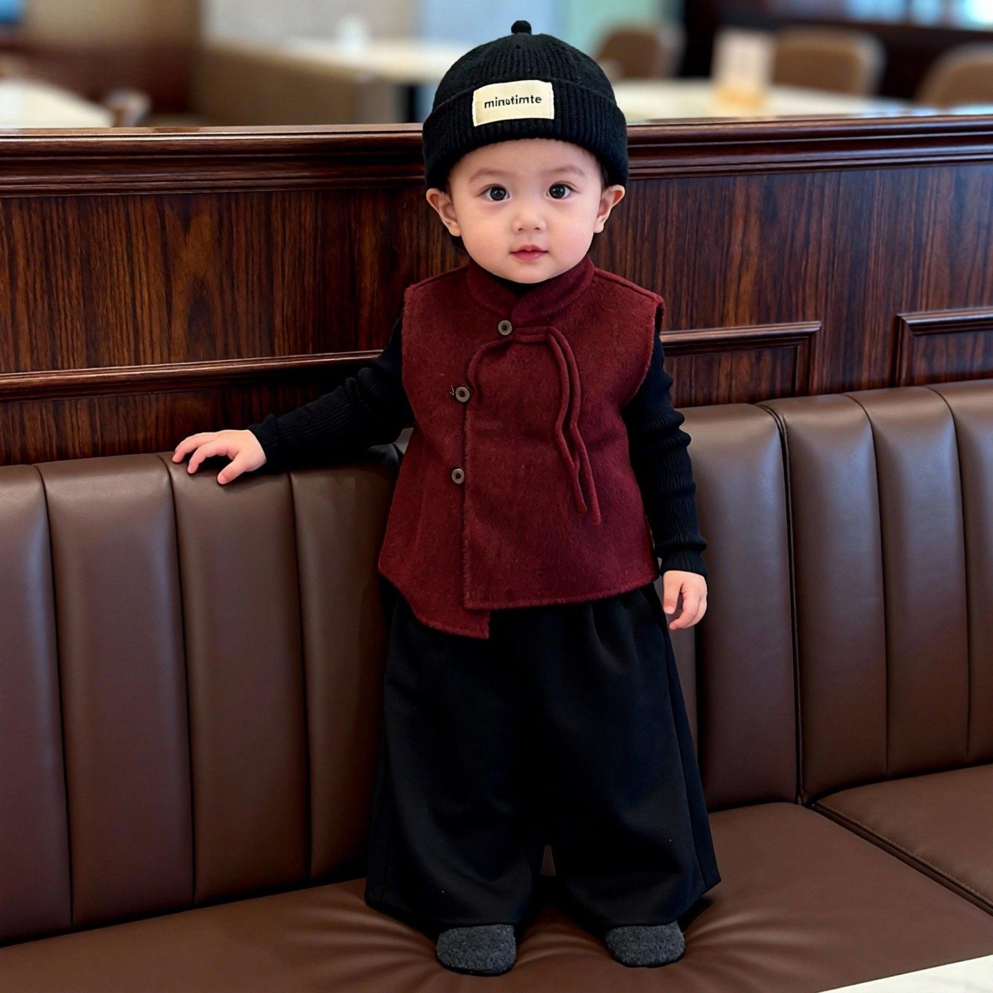 婴儿冬季新款套装男女童红色新中式毛呢马甲新年喜庆生日周岁套装