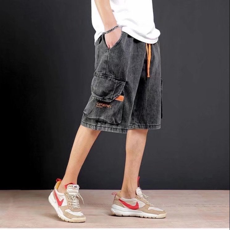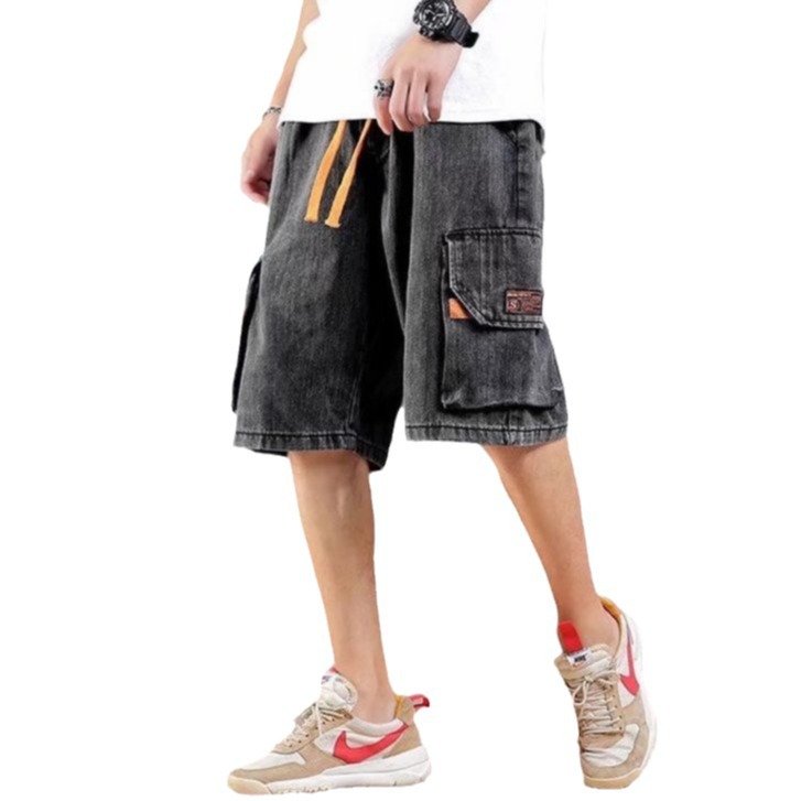 多口袋牛仔短裤男士夏季宽松大码休闲松紧腰薄款耐磨工装五分裤子