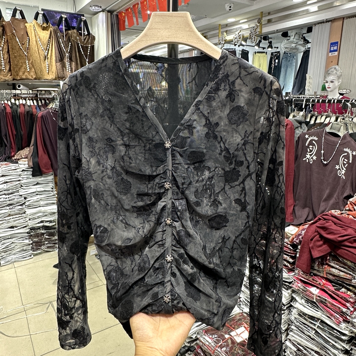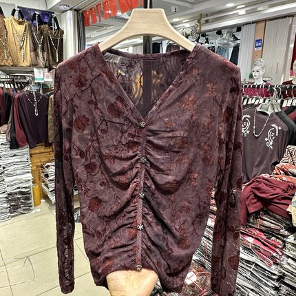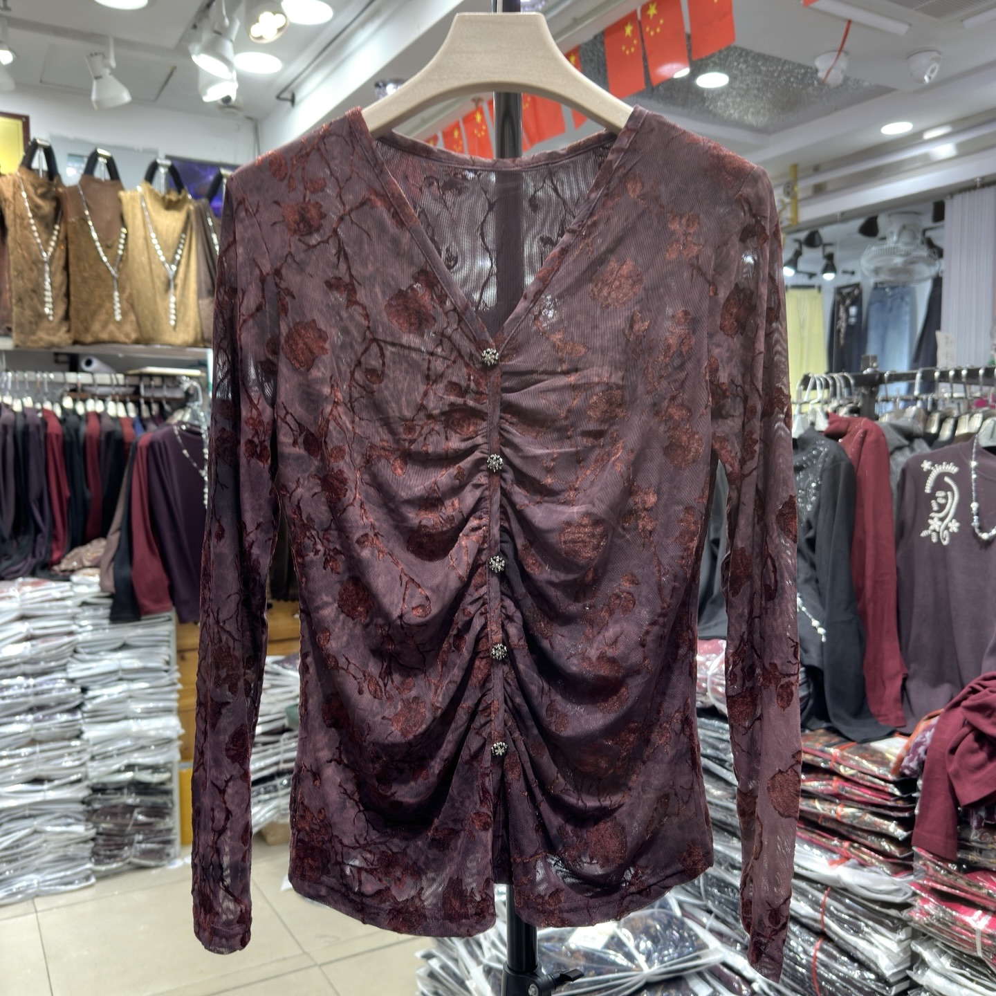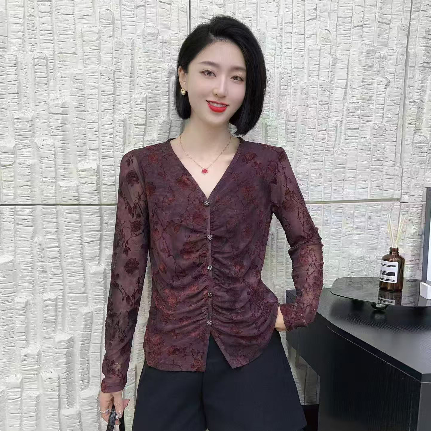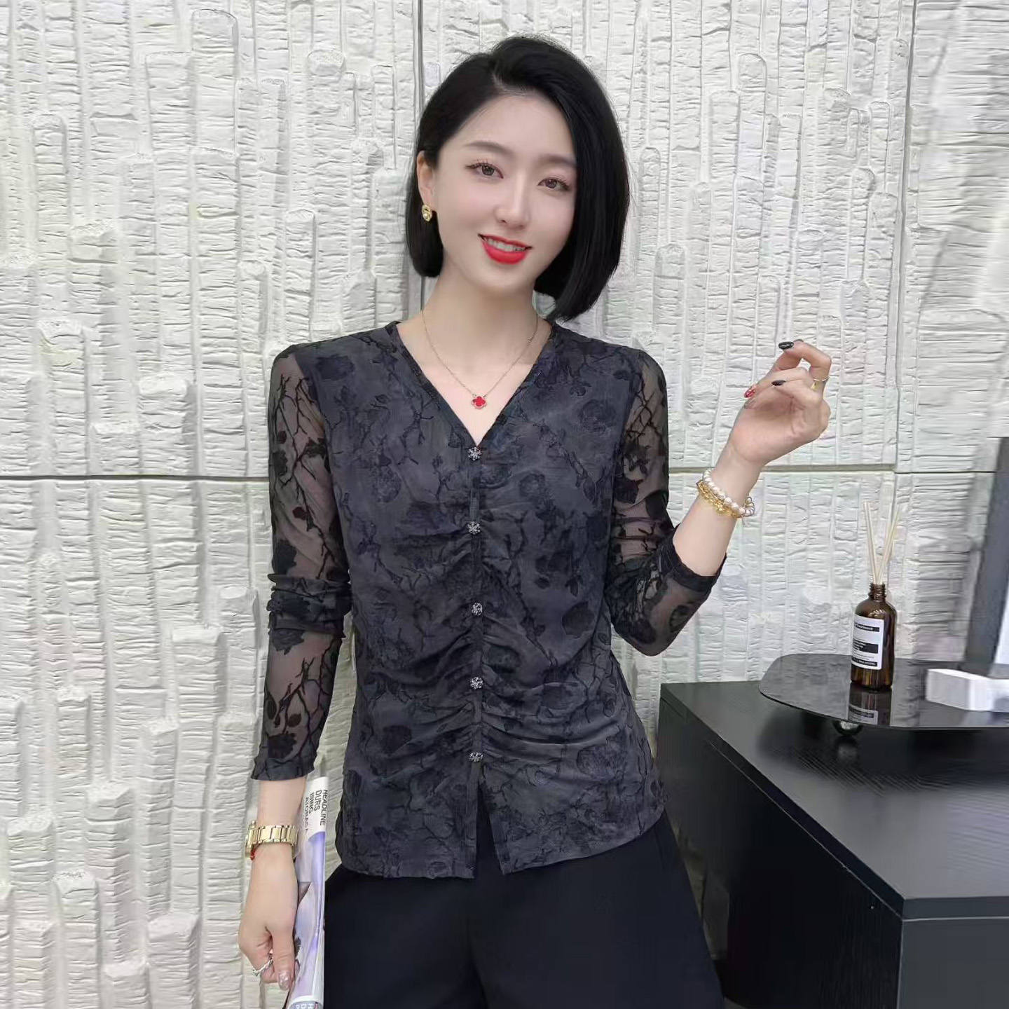 时尚妈妈装V领网纱刺绣花朵打底衫秋装新款洋气褶皱中老年长袖T恤