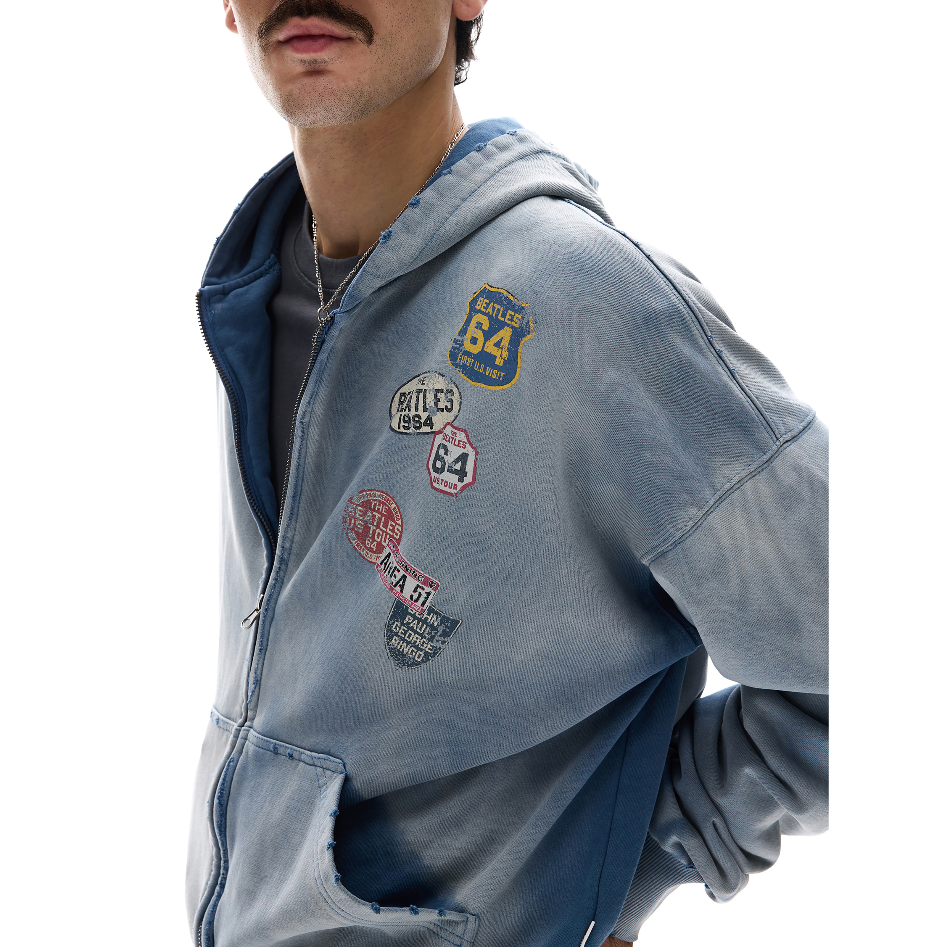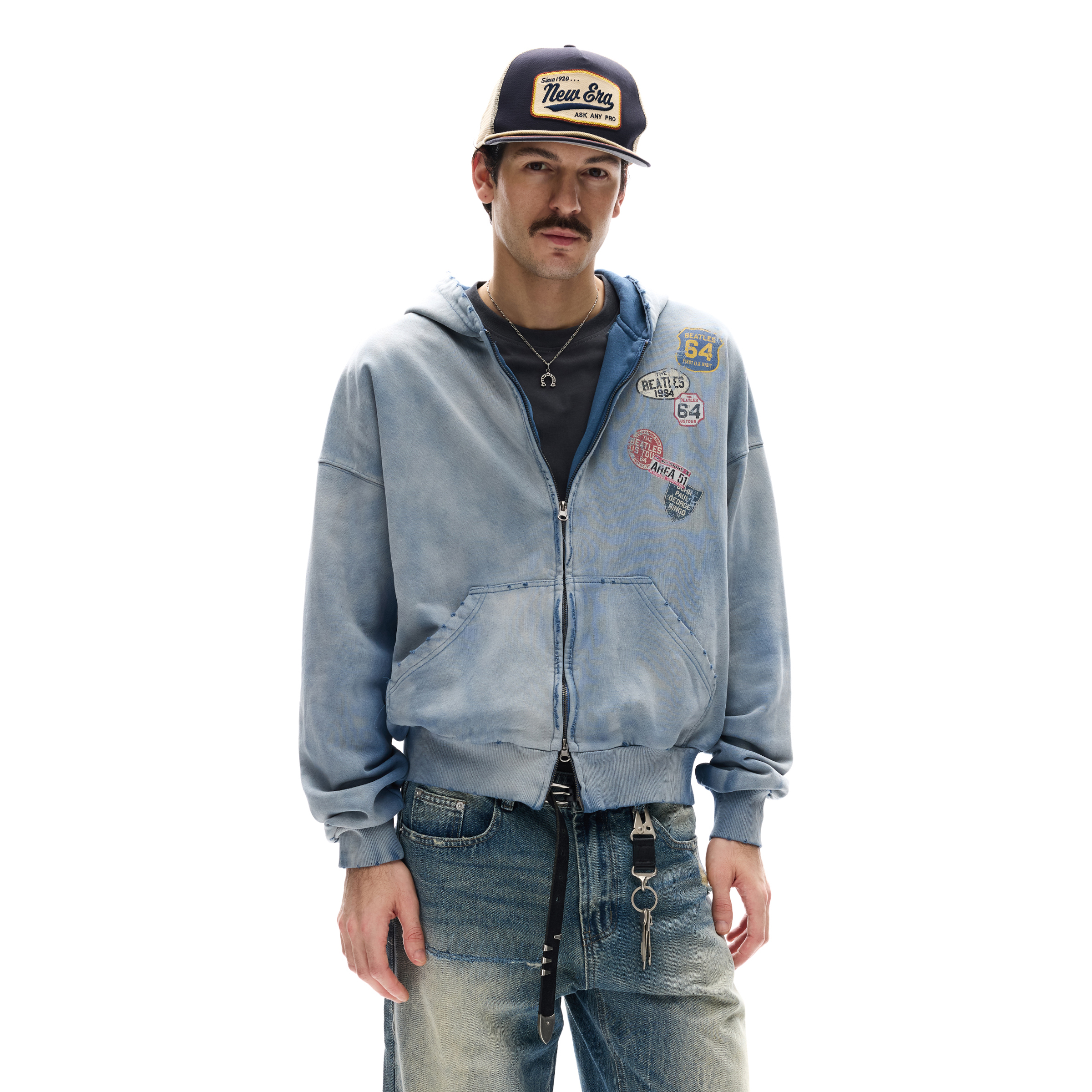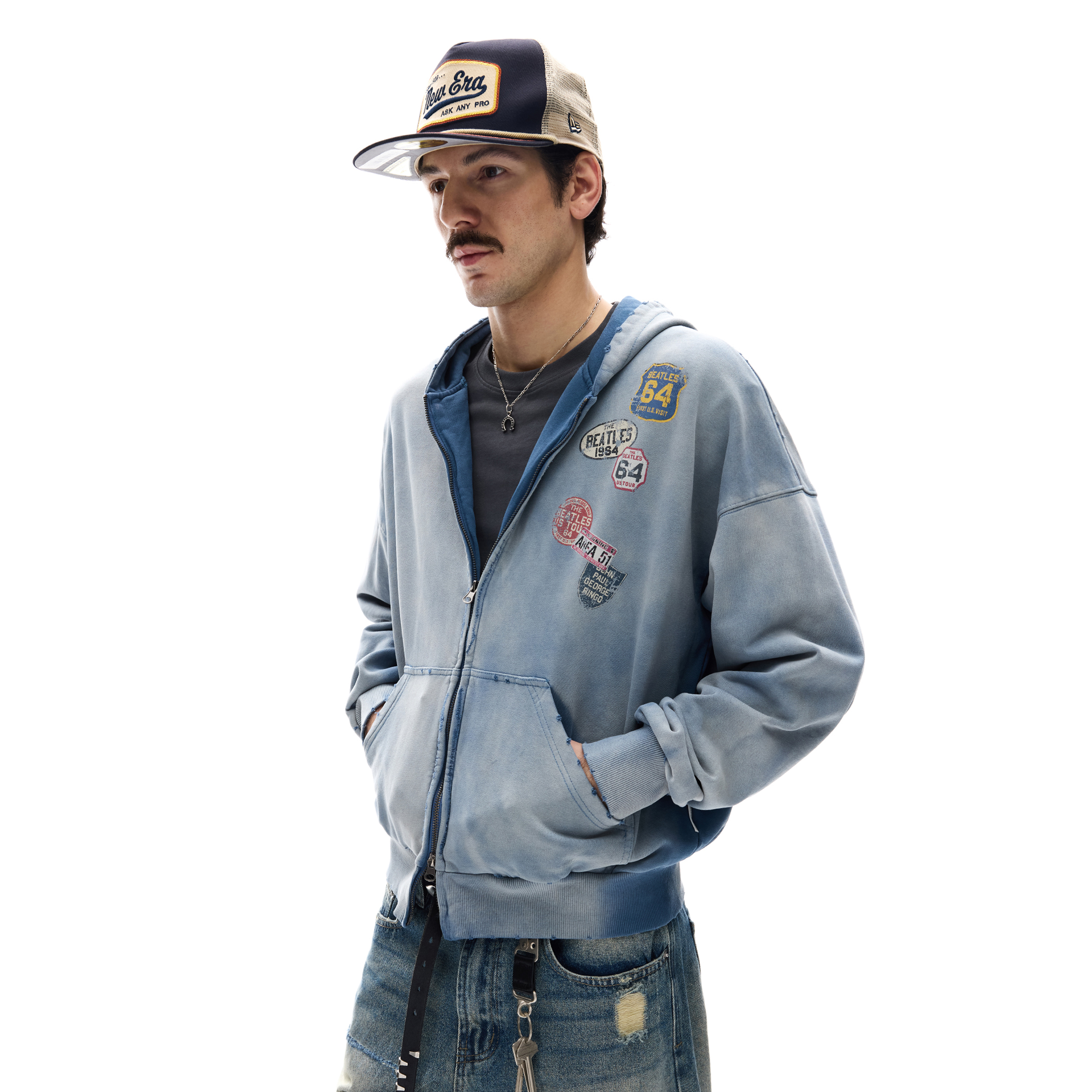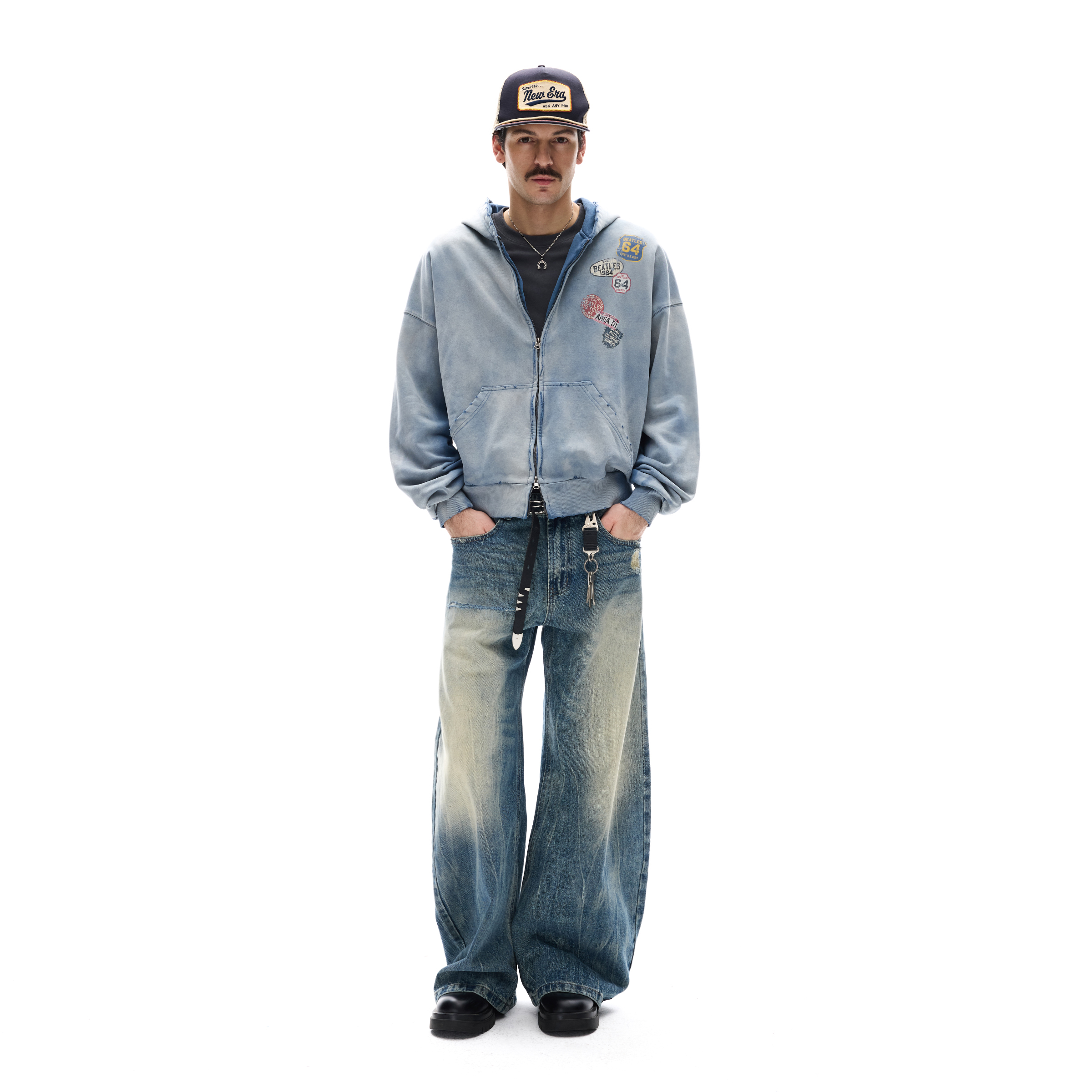 MADWITCH复古做旧磨破标签印花连帽卫衣男女短款设计感开衫外套潮