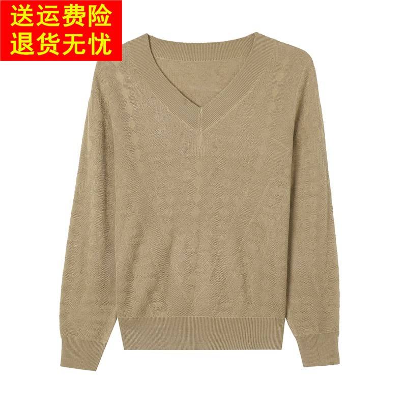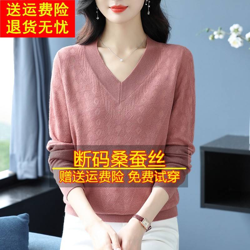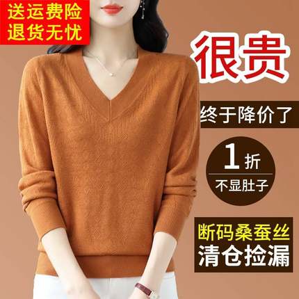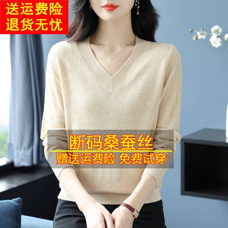 桑蚕丝长袖t恤女秋新款洋气V领打底小衫妈妈宽松大码遮肚针织上衣
