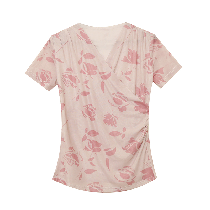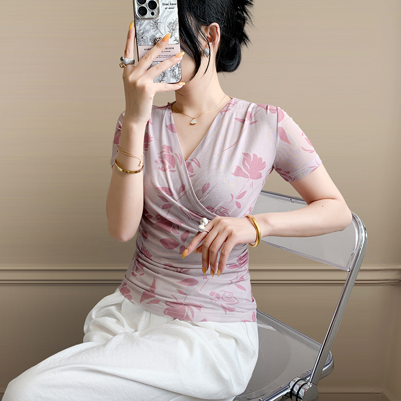 夏装时尚减龄碎花上衣女性感V领网纱短袖T恤气质褶皱收腰半袖小衫