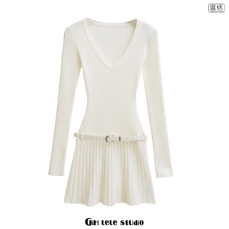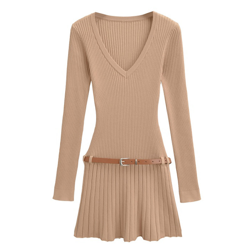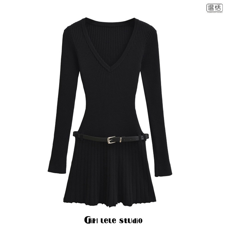 【包邮】美式复古风时尚V领针织连衣裙长袖修身显瘦百褶腰带短裙