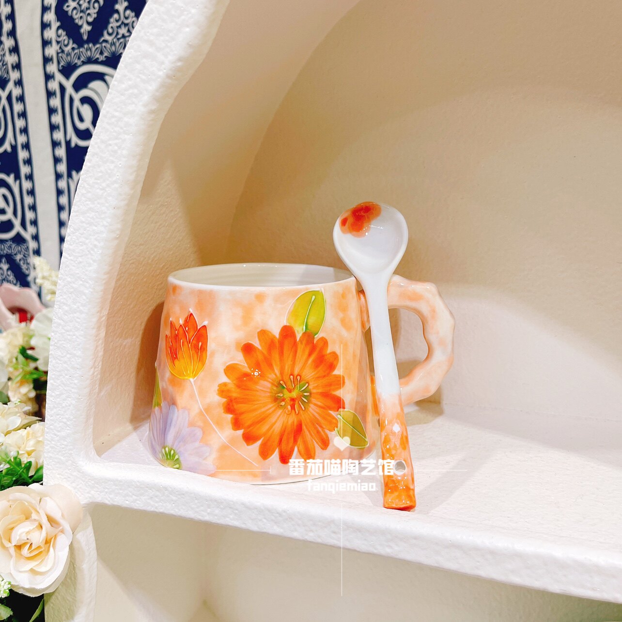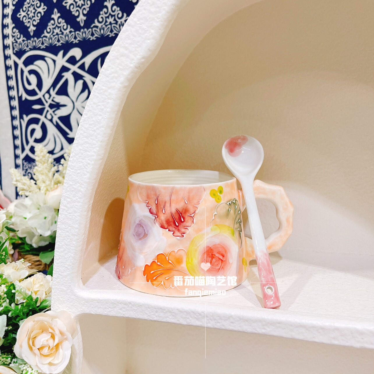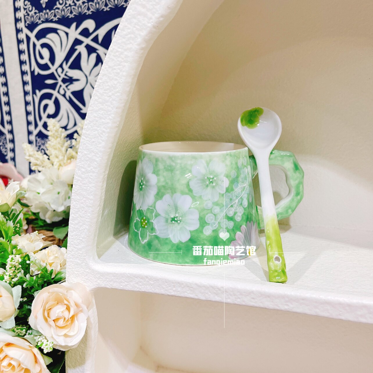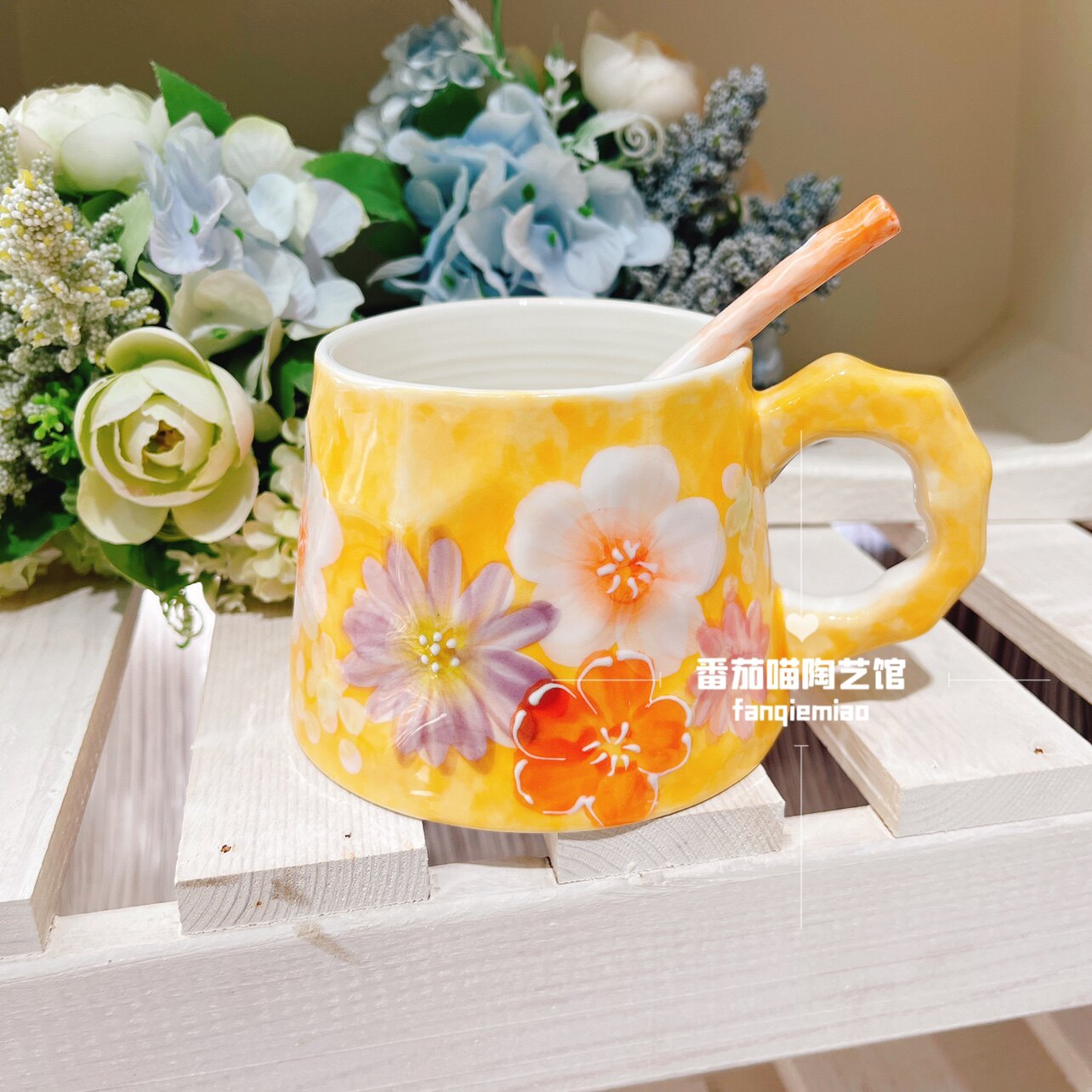 F23新款濑户烧陶瓷釉下彩马克杯大肚竹杯水杯满花浮雕送勺果汁杯